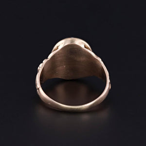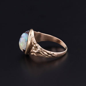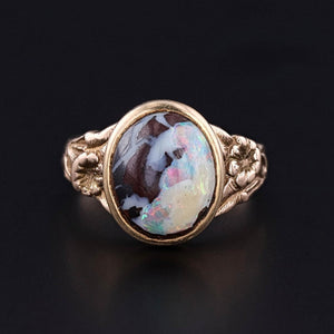 Boulder Opal Flower Ring: This enchanting ring features a colorful boulder opal set in a floral 10k gold mounting. A unique creation, the ring combines elements from two antique pieces: the band was repurposed from a 10k gold signet ring (circa 1920), while the opal centerpiece originated from a 14k gold stickpin (circa 1910). The result is a one-of-a-kind piece that beautifully marries history and artistry.