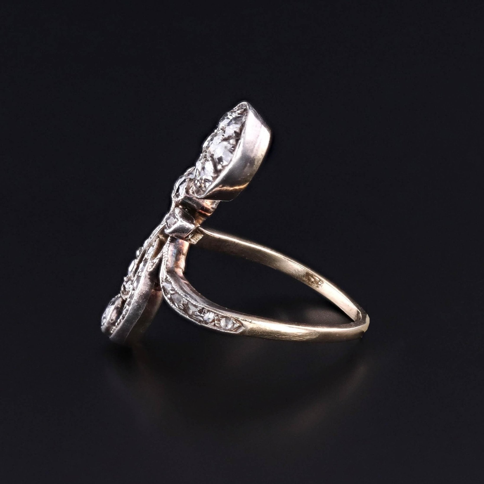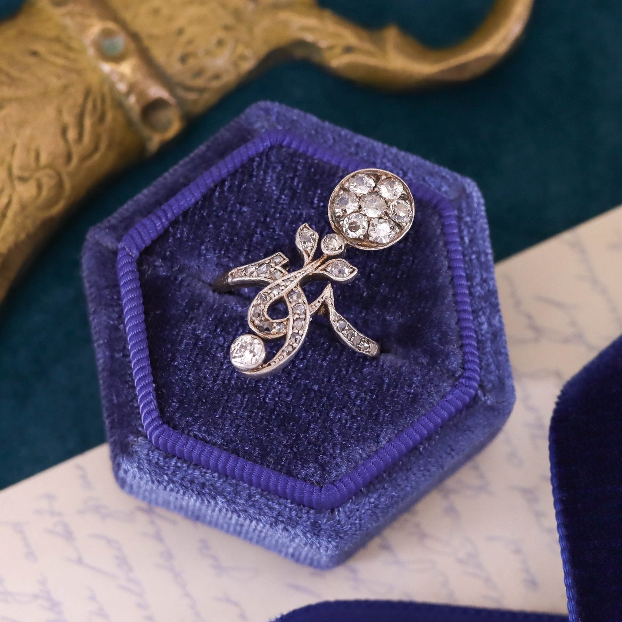 This exquisite antique ring (circa 1910) showcases a beautifully sculpted flower composed of old European cut and old mine cut diamonds, all set in silver atop 14k gold—a hallmark of Edwardian-era craftsmanship. The diamonds, with a combined total carat weight of approximately 0.97ct, shimmer with the unique charm and character only antique cuts can offer. Their subtle asymmetries and deep facets capture light with a romantic brilliance evocative of a bygone era.