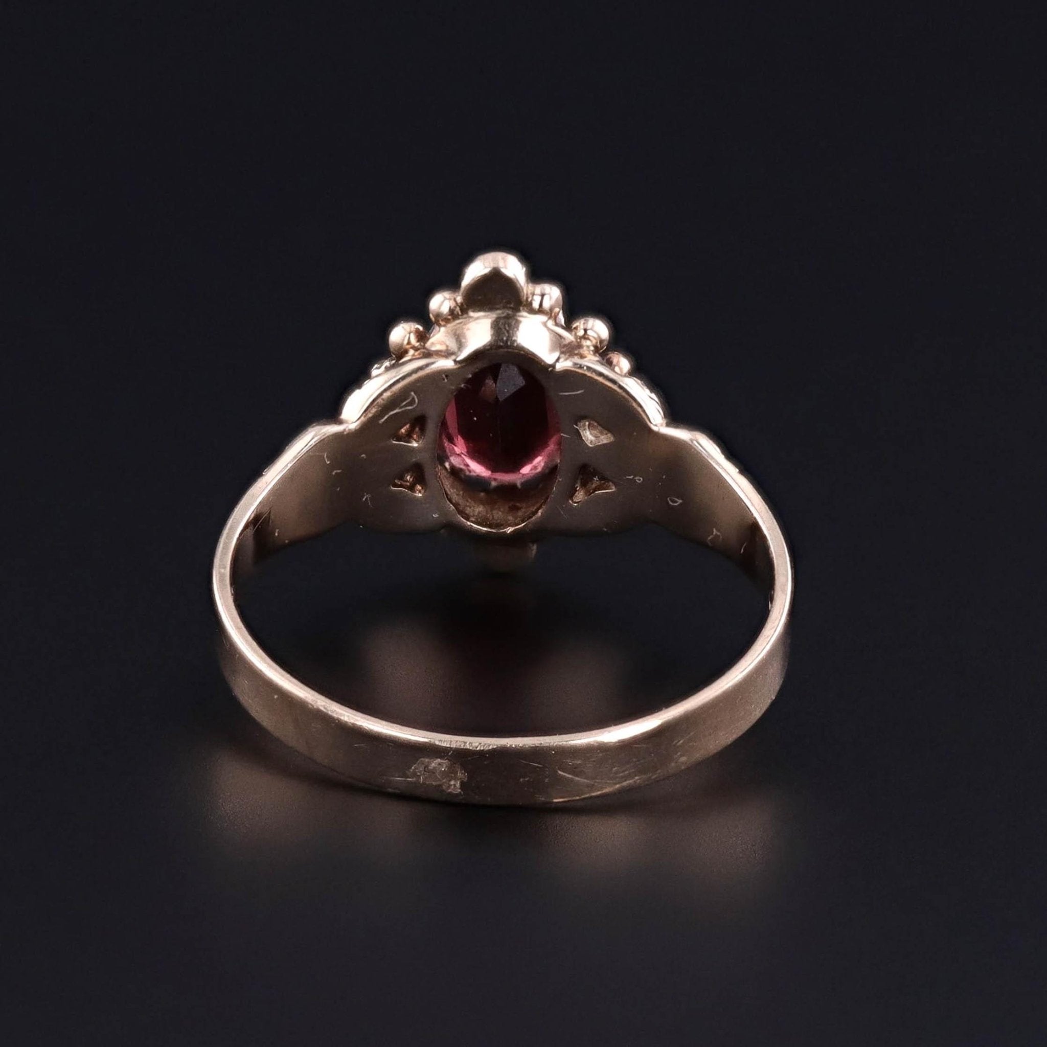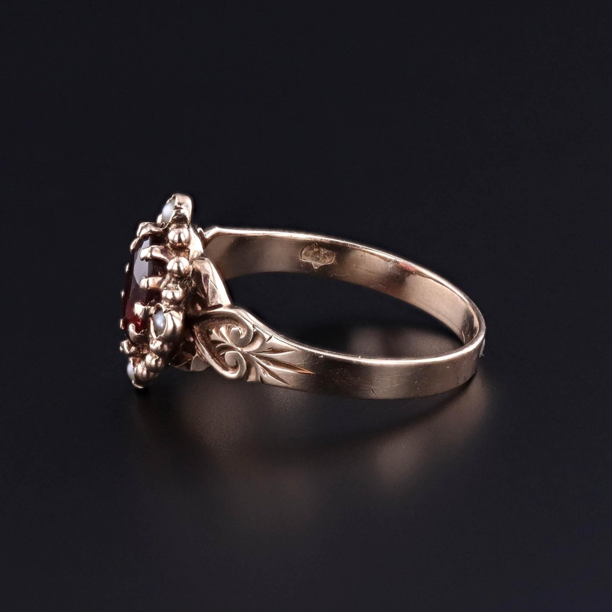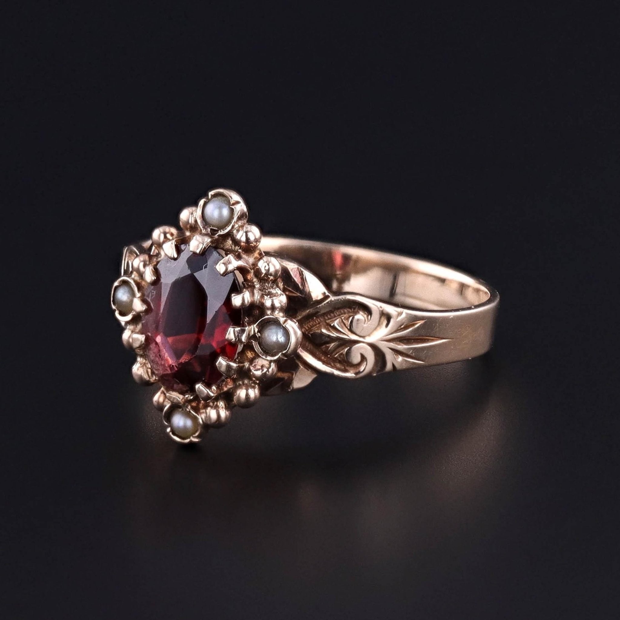Antique Garnet Ring: This antique ring (circa 1890-1900) features a garnet with split seed pearl accents set in 10k gold.