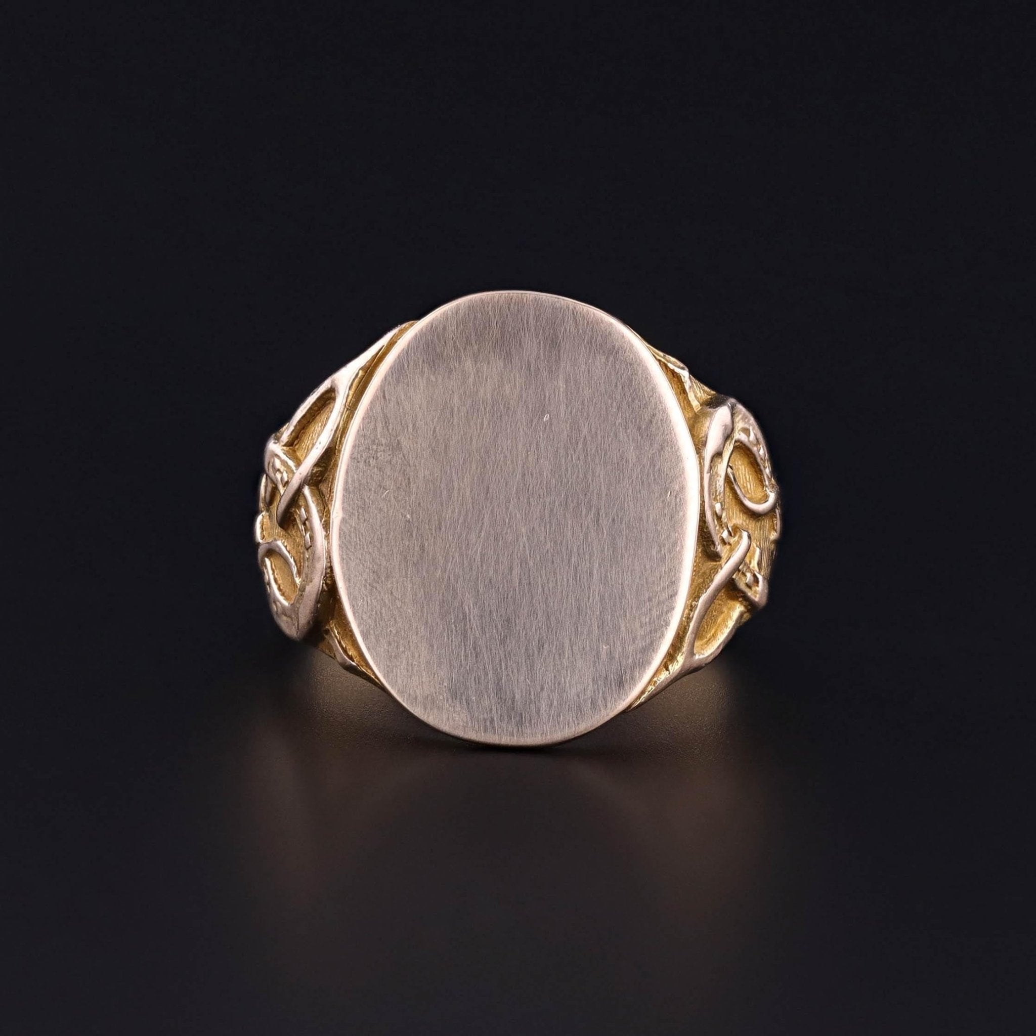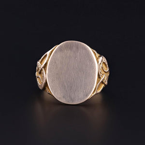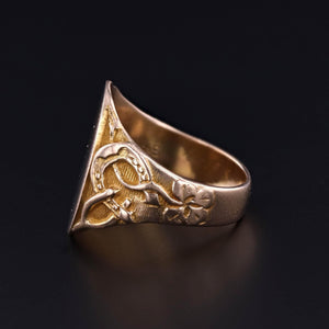 Antique Good Luck Ring: This antique signet ring features a horseshoe, wishbone, and four leaf clover on the shoulders of the 14k gold ring. The inside of the band bears the inscription 'Ednato Ira x1912'.