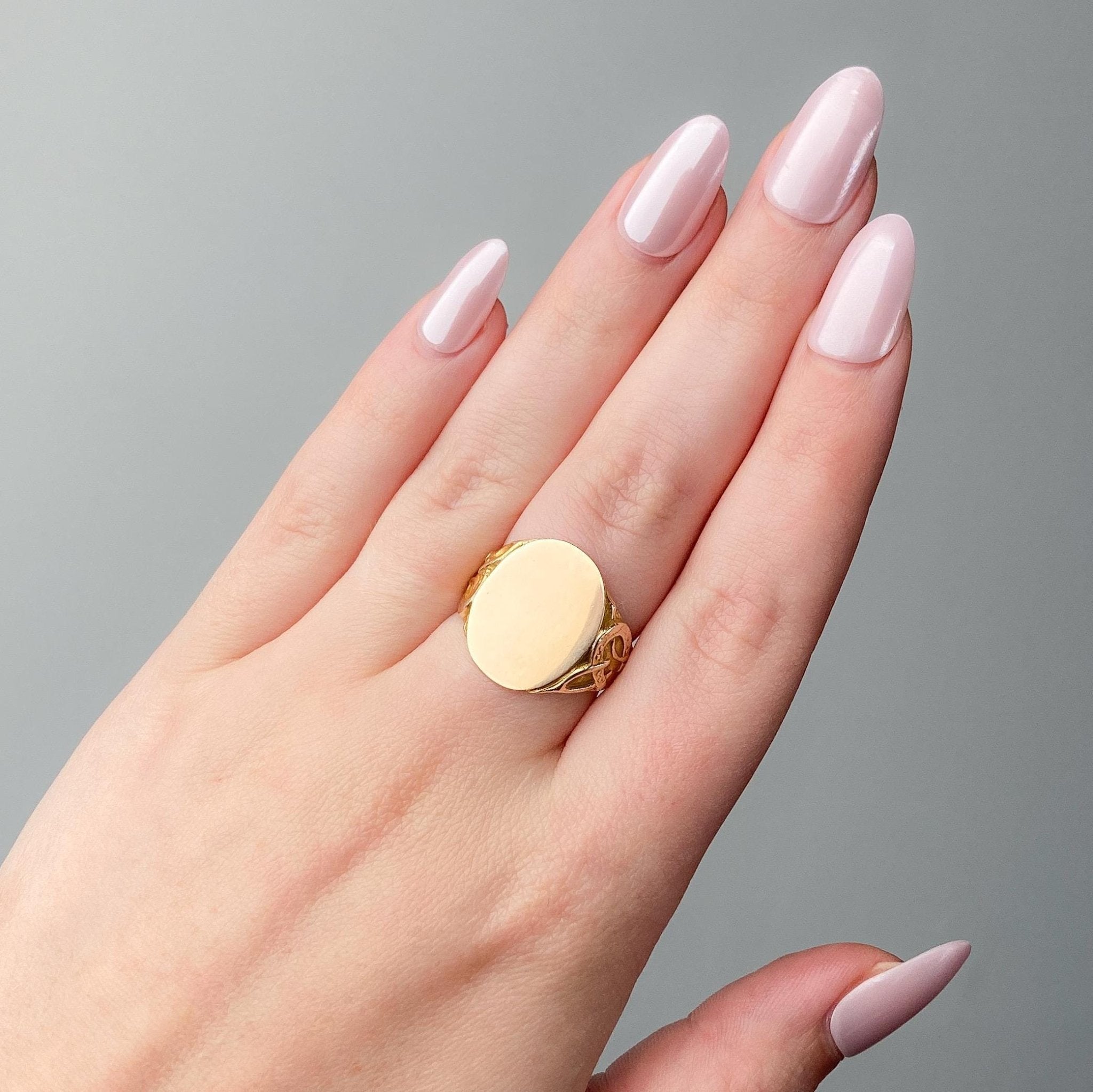 The face measures 0.7 inches by 0.6 inches wide and is in great condition. It is a size 7, but can be resized free of charge.