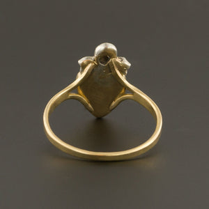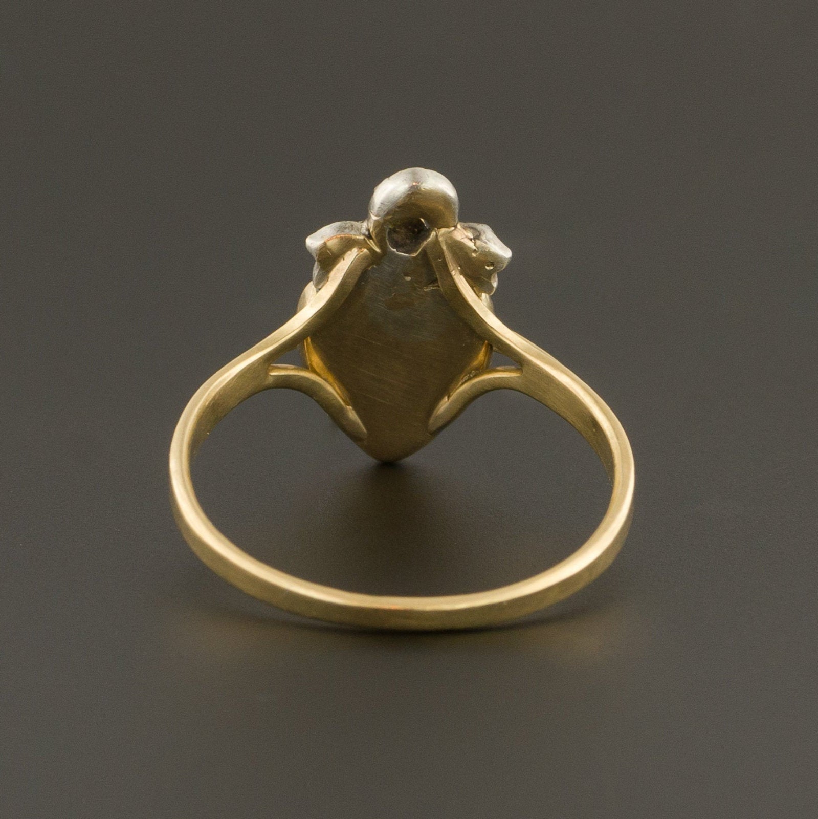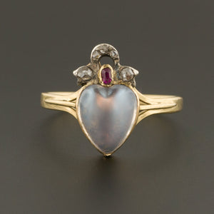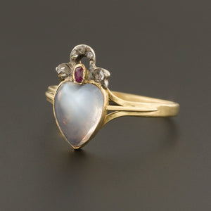 This lovely ring features a heart shaped moonstone set in 18k yellow gold surmounted by a diamond and ruby bow. The top of this ring was originally an antique yellow gold and silver stick pin (circa 1860-1880) transformed with the addition of a 18k gold band.