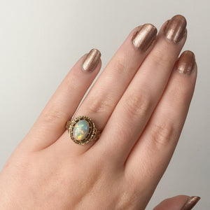 This vintage ring (circa 1920) features a fiery white opal set in an ornate 14k gold mounting