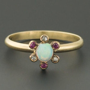 An Antique Opal Ring | Opal Halo Ring | 14k Gold Opal Ring | Pin Conversion Ring | Birthstone Ring | Ruby Diamond & Opal Ring Antique Ring