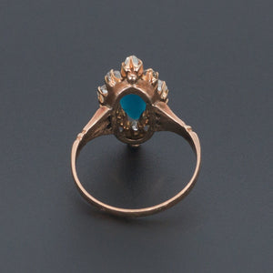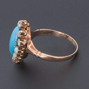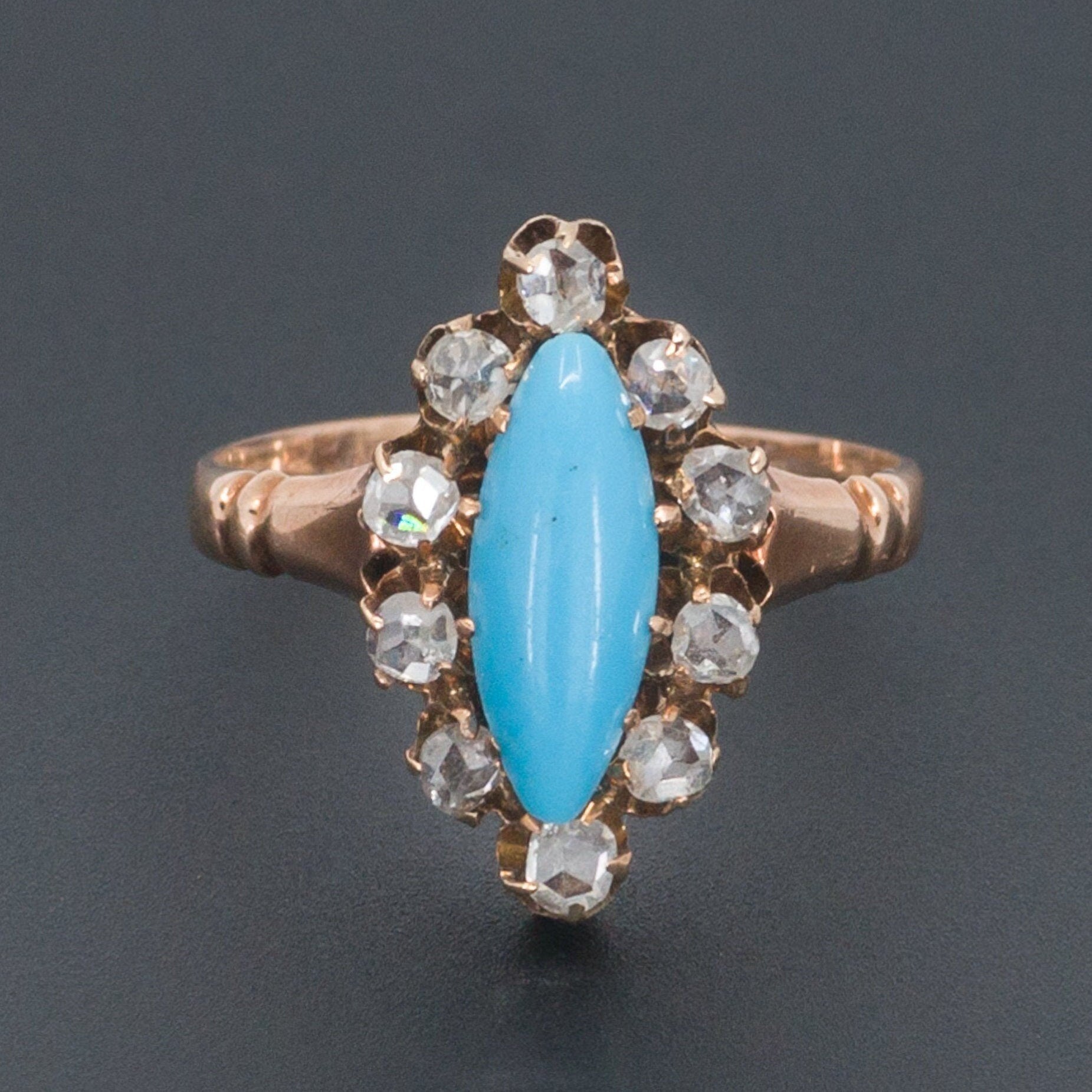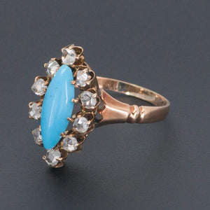 A lovely ring from the late Victorian or Edwardian era (circa 1880-1900) featuring a turquoise glass navette surrounded by 10 rose cut diamonds in a 14k gold mounting.