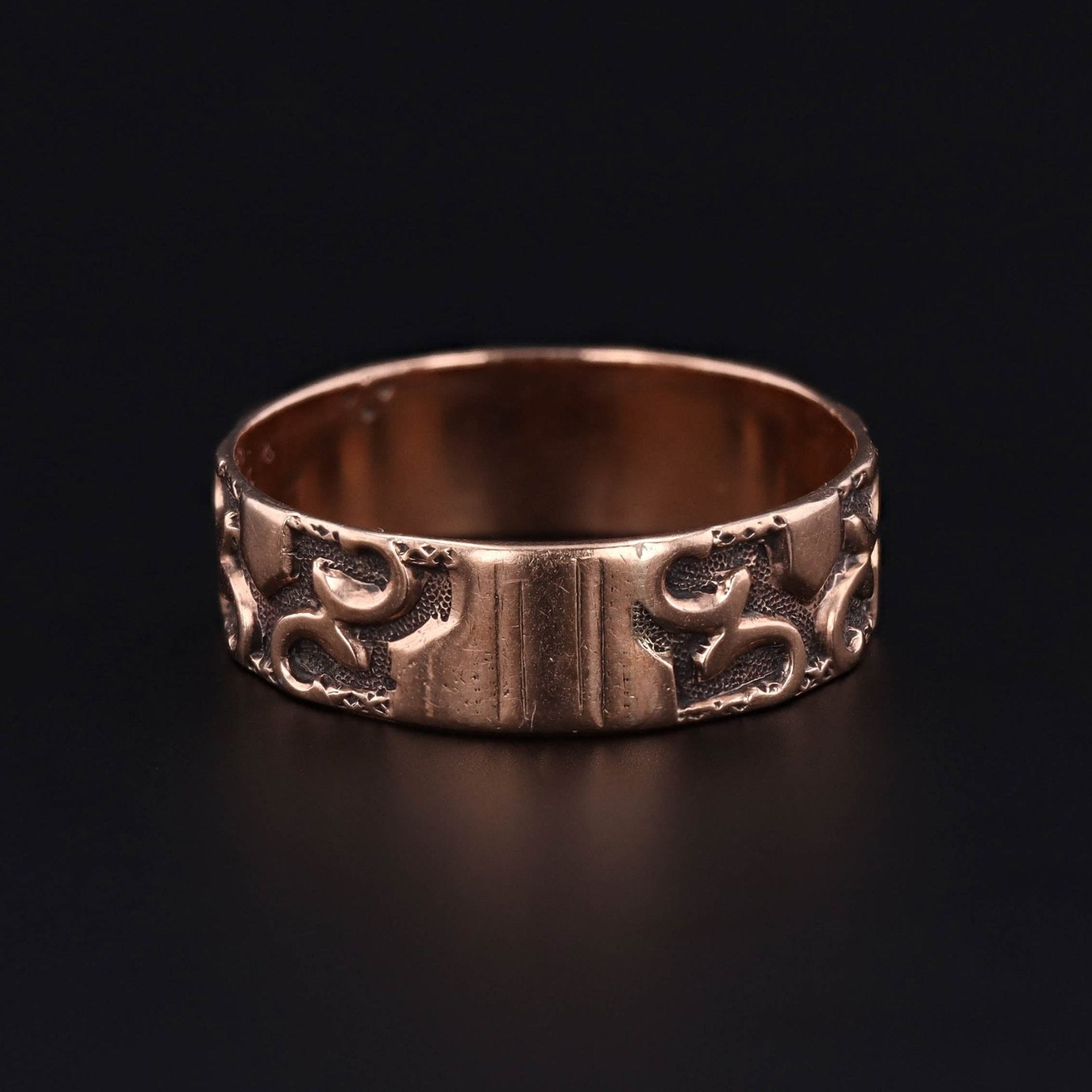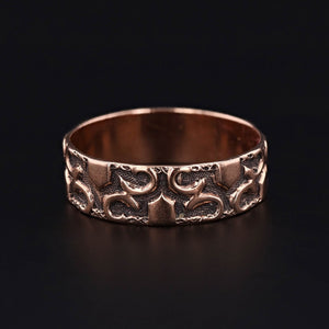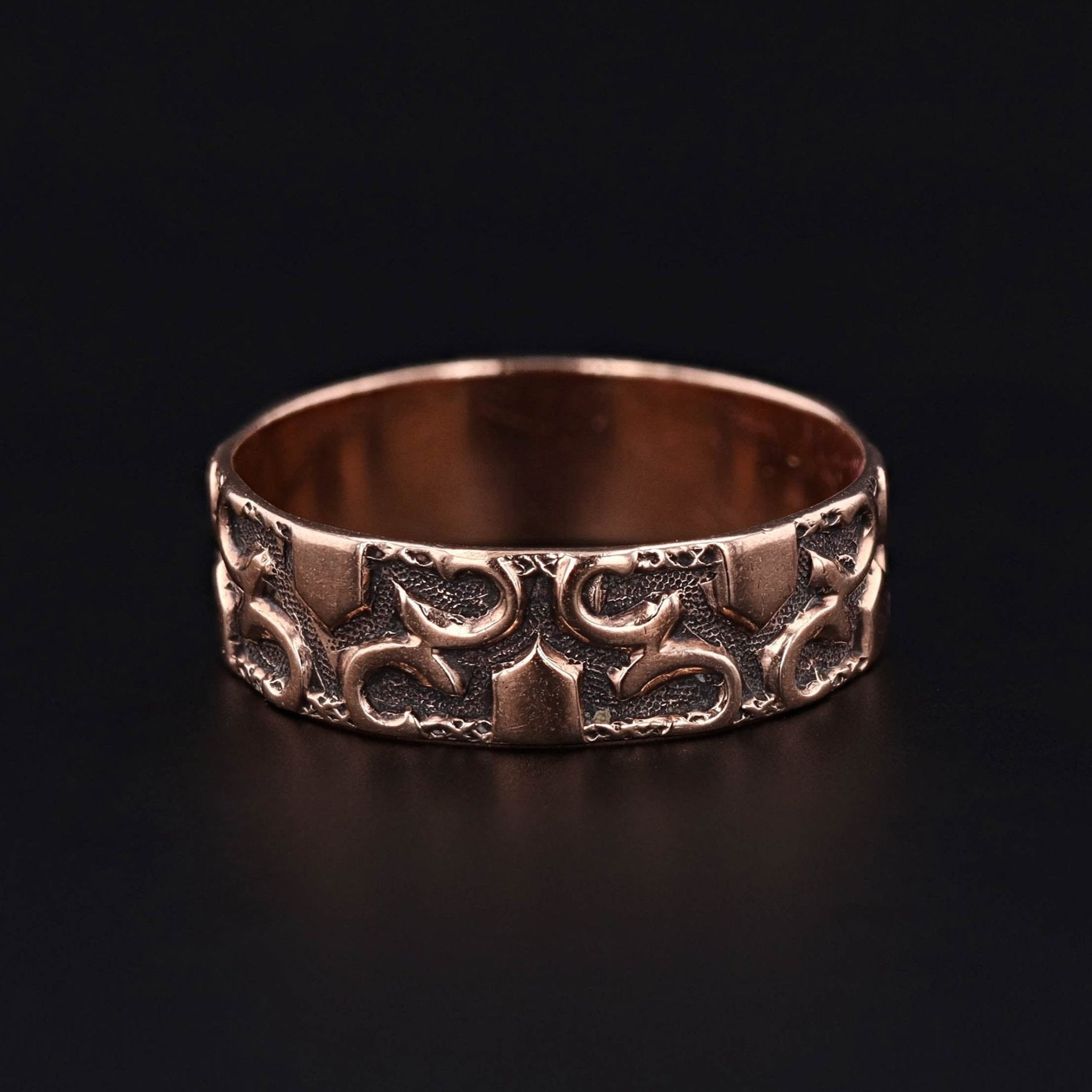 A lovely 10k rose gold "cigar band" style ring (circa 1880-1900) featuring an embossed pattern. This flat ring is quite comfortable to wear and would make a perfect wedding band or stacking ring.