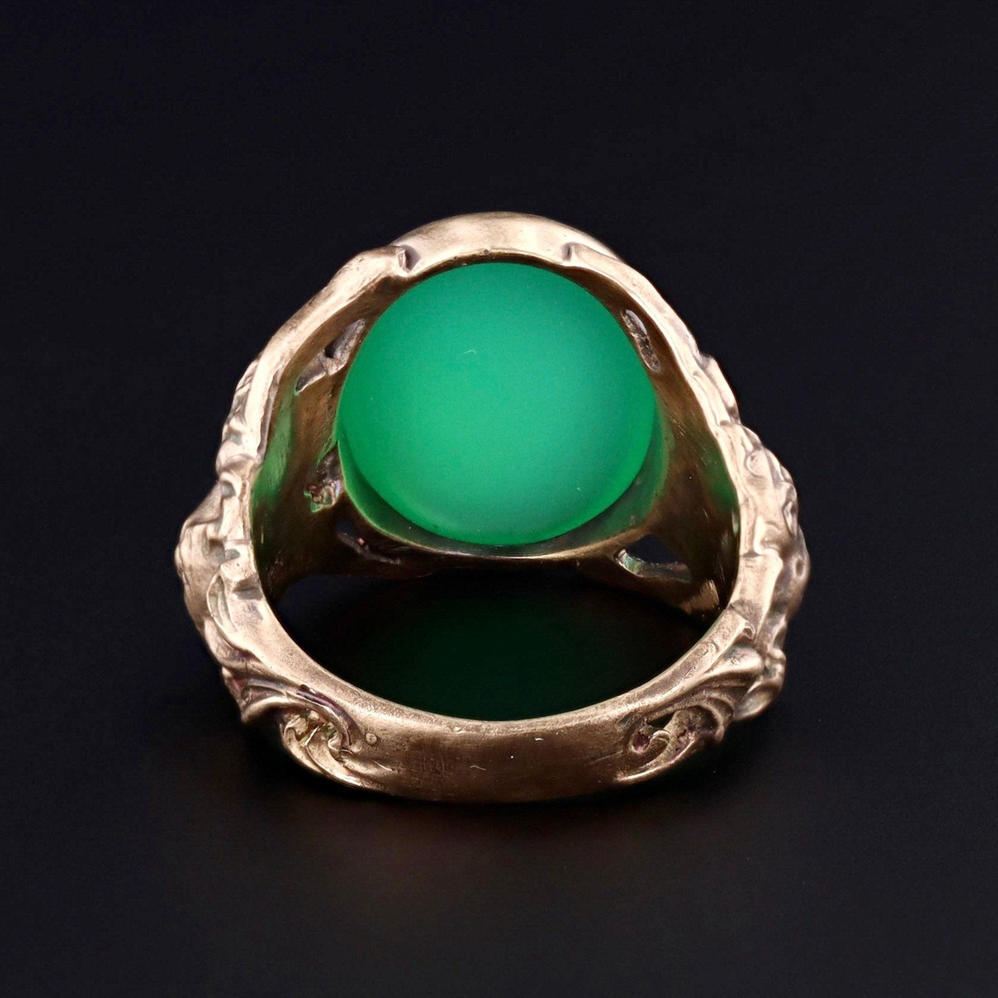 This chrysoprase cabochon is set in an elegant Art Nouveau style mounting that we cast and reproduced from an antique signet ring. The mounting is 14k gold and each side depicts a woman emerging from a flower.