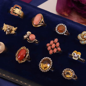 Celebrate the enduring romance of the Art Nouveau era with this exquisite antique ring, dating to circa 1910–1920. Crafted in 10k gold and showcasing a richly hued orange coral cabochon, the ring’s vibrant centerpiece is nestled within an ornate foliate mounting—an elegant nod to the period’s love of organic, nature-inspired forms.