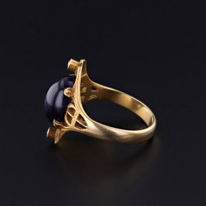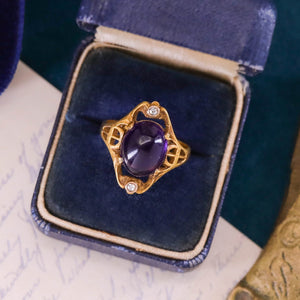 A jewel of understated elegance, this antique ring (circa 1910–1920) features a smooth amethyst cabochon flanked by two sparkling single-cut diamonds, all set in a finely crafted 10k gold mounting. The amethyst, a later replacement, brings a vivid splash of color while preserving the ring’s early 20th-century character.