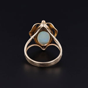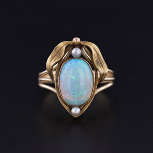 Antique Opal and Pearl Ring: This ring features a fiery white opal and two pearls mounted in 12ct gold. The top of the ring was originally an antique stickpin (circa 1900) that our jeweler transformed by removing the pin and adding a 14k gold band.