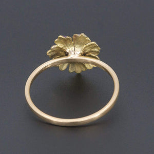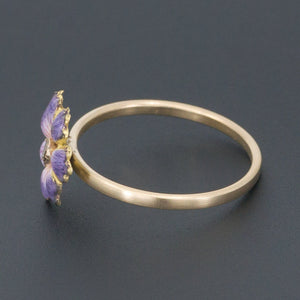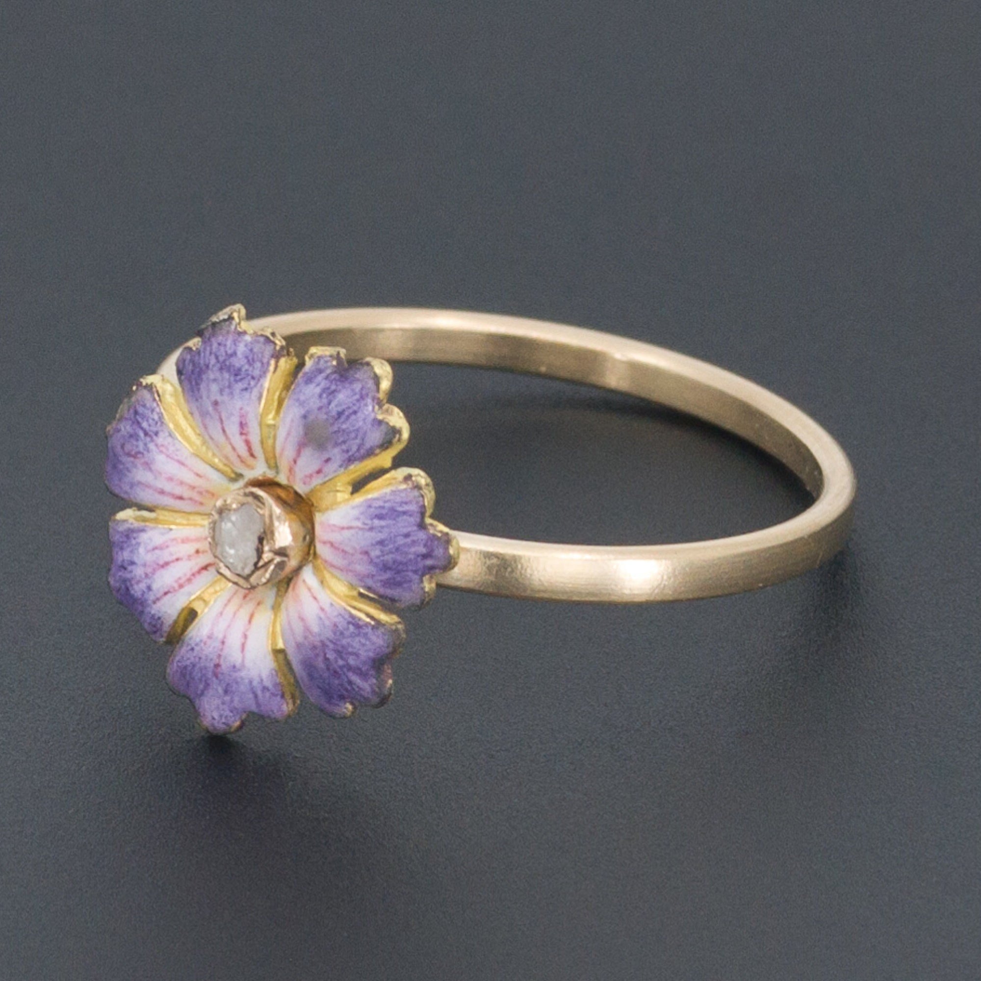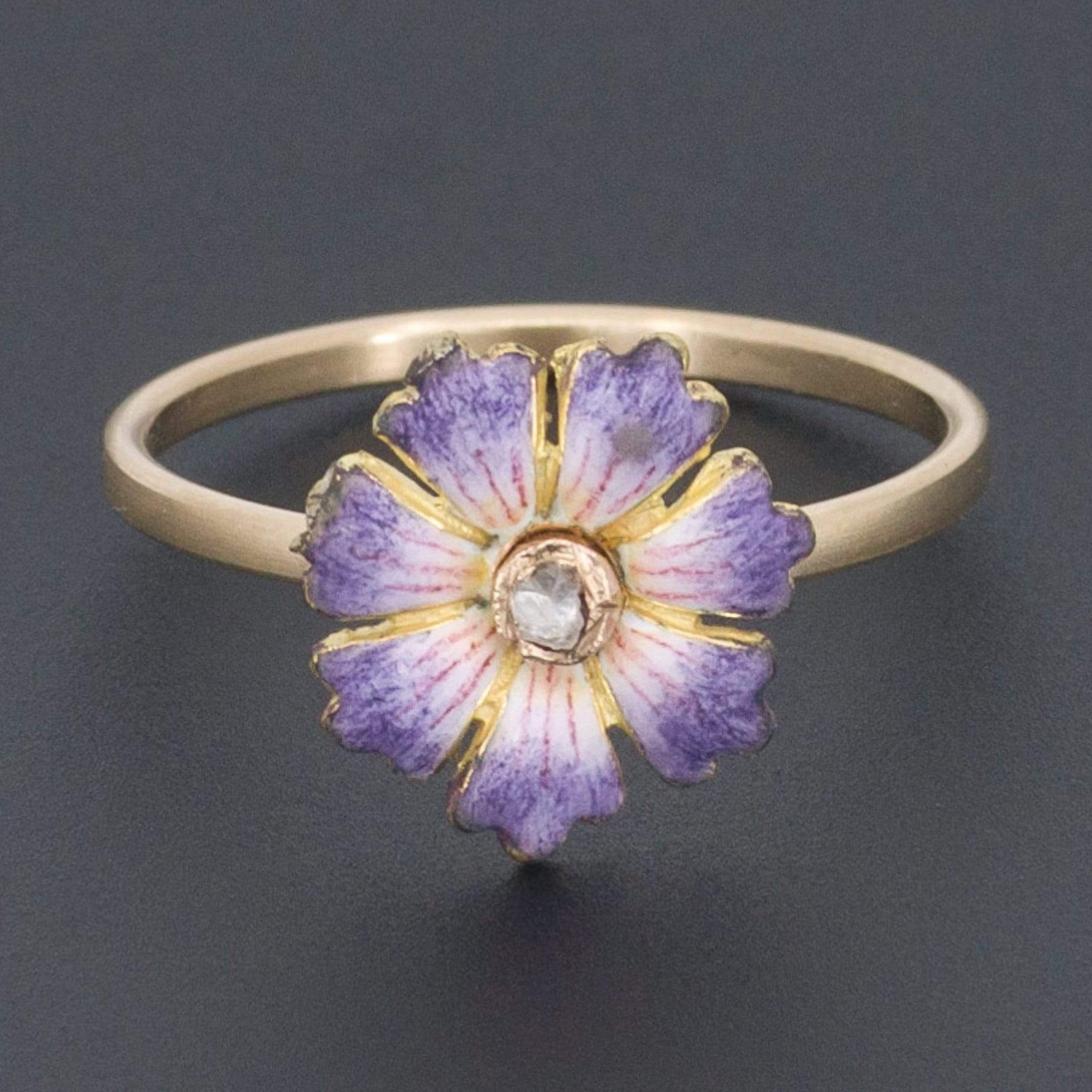 This vibrant purple enamel blossom of 14k gold treats the eyes to a visual delight. Set with a glistening rose cut diamond accent, the flower was originally part of an antique pin (circa 1905-1915) transformed by removing the flower and welding on a 14k gold band.