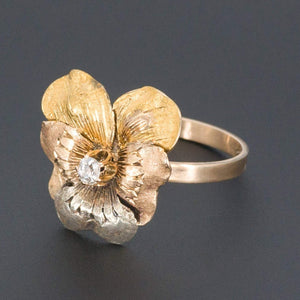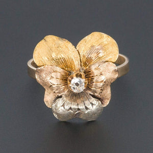 This glistening gold pansy ring holds a 0.06ct cushion cut diamond at its center and blooms outward with delicate tri-color gold petals. The charming pansy was originally part of an antique pin transformed with the addition of a 14k gold band.
