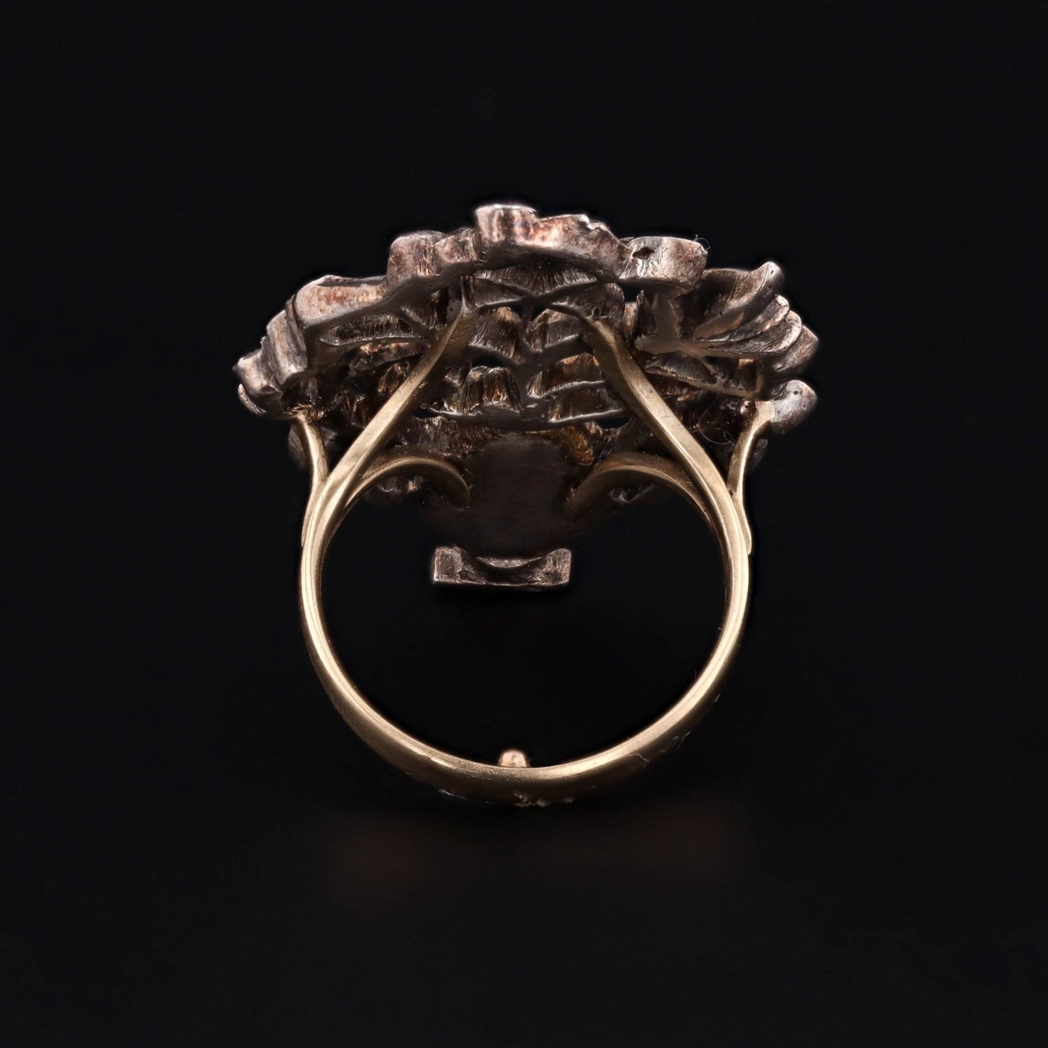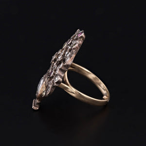 The antique face of the ring is silver, while the mounting is 14k yellow gold. The ring is in good condition; however, some of the gemstones are later replacements and there is chipping to two of the garnets (visible under magnification). There is also some discoloration to the foil beneath the large diamond that is visible under magnification.