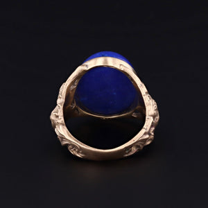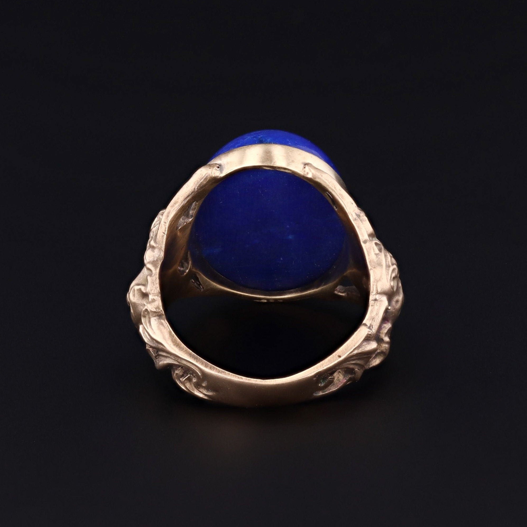 The lapis is set in an elegant Art Nouveau style mounting that we cast and reproduced from an antique signet ring. The mounting is 14k gold and each side depicts a woman emerging from a flower.
