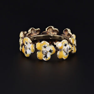 This colorful vintage ring (circa 1945-1965) features eight yellow enamel pansies on a substantial 14k gold band (marked).
