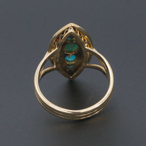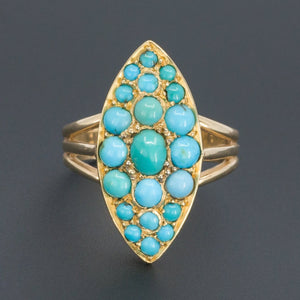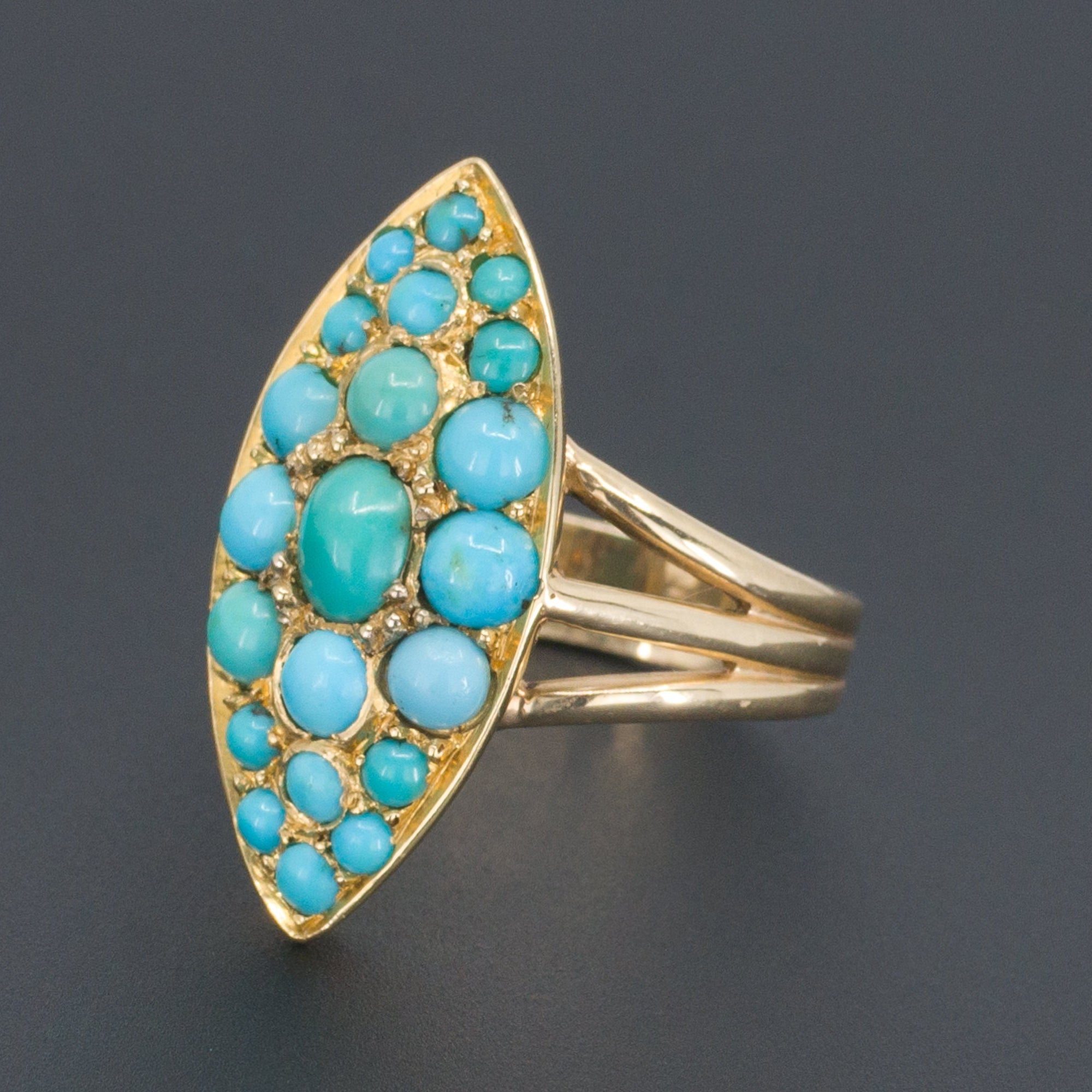 This eye-catching ring features a pave of vibrant turquoise cabochons set in buttery 14k yellow gold (unmarked, but acid tested).