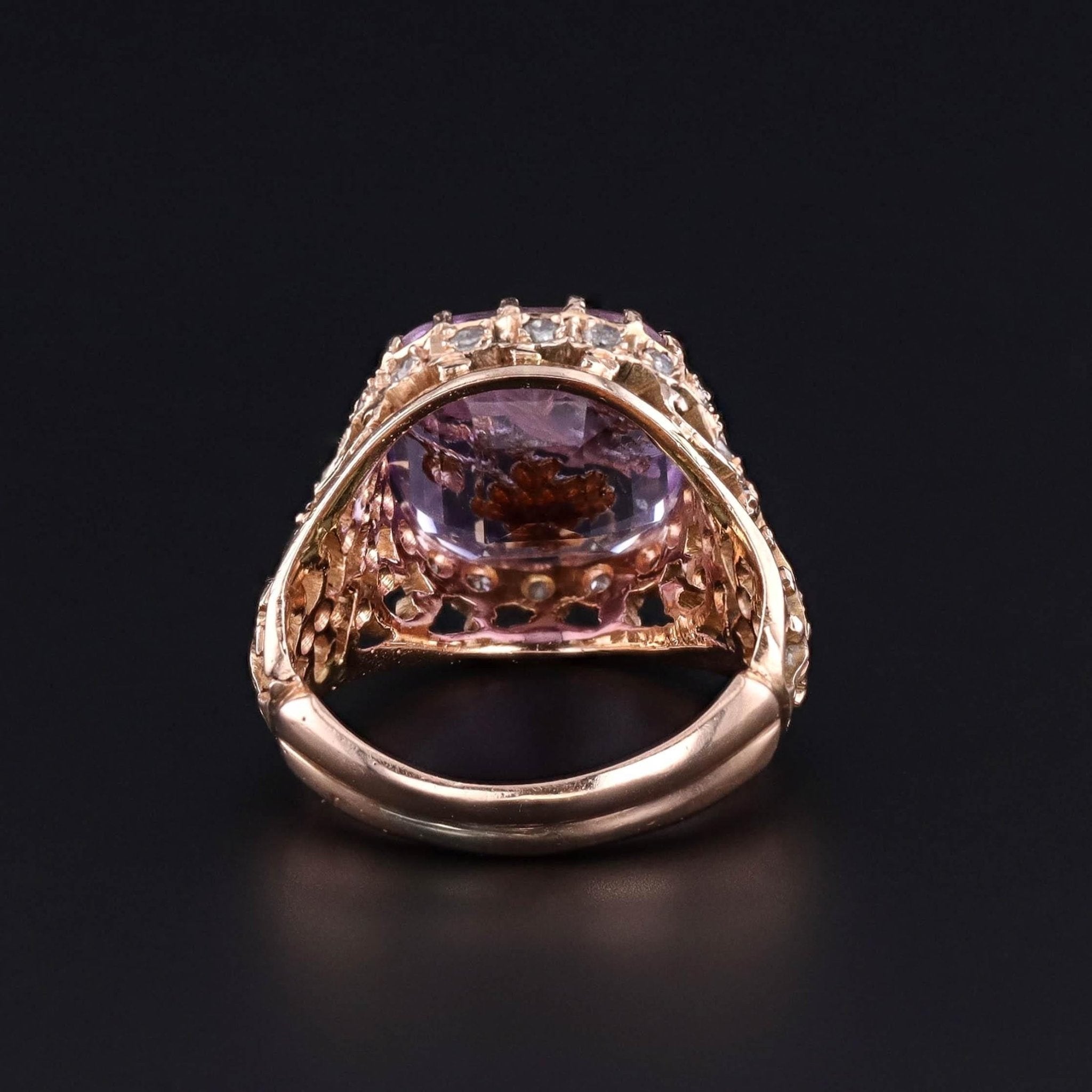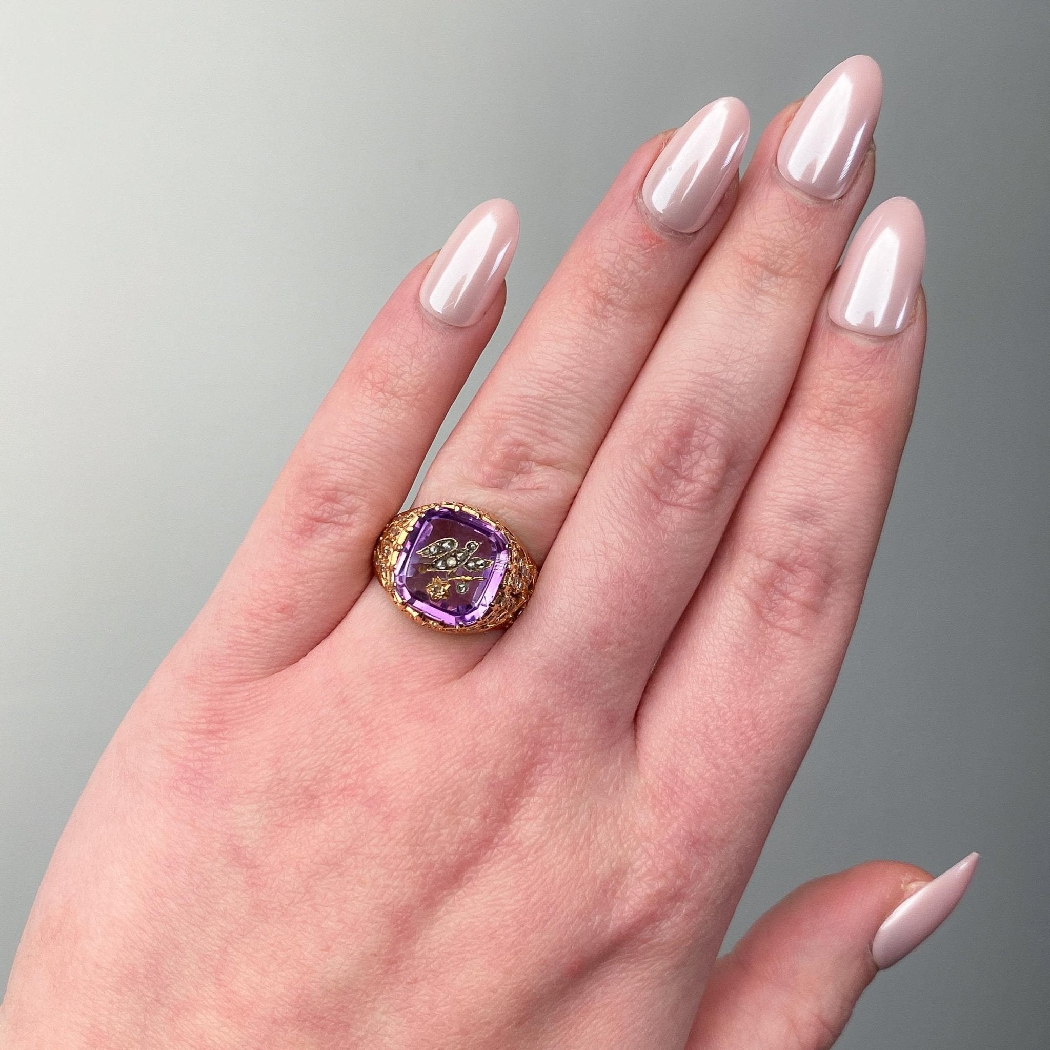 This extraordinary Victorian ring (circa 1880) showcases a richly carved amethyst, its surface adorned with a rose cut diamond bird and flower—motifs celebrating nature, renewal, and sentiment. The gem is mounted in an ornate 18k gold setting, further embellished with sparkling single cut diamond accents that bring the jewel to life with light and texture.