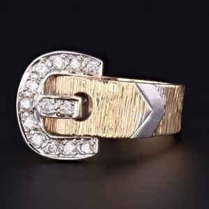 This 14k yellow and white gold buckle ring glitters with diamond accents. The ring dates to the 1980s and is unmarked, but acid tests for 14k gold.