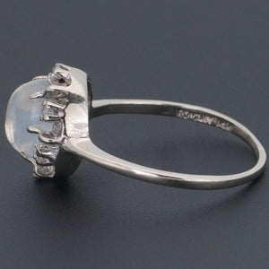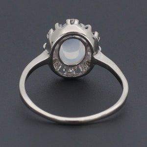 This stunning ring features a luminescent moonstone cabochon surrounded by a halo of six glistening diamonds.