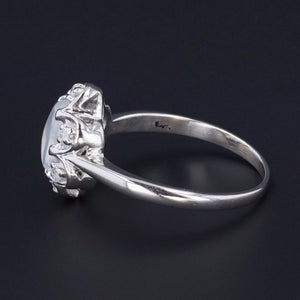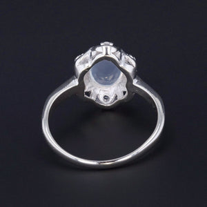 This stunning ring features a luminescent moonstone cabochon surrounded by a halo of faceted rock crystal accents.