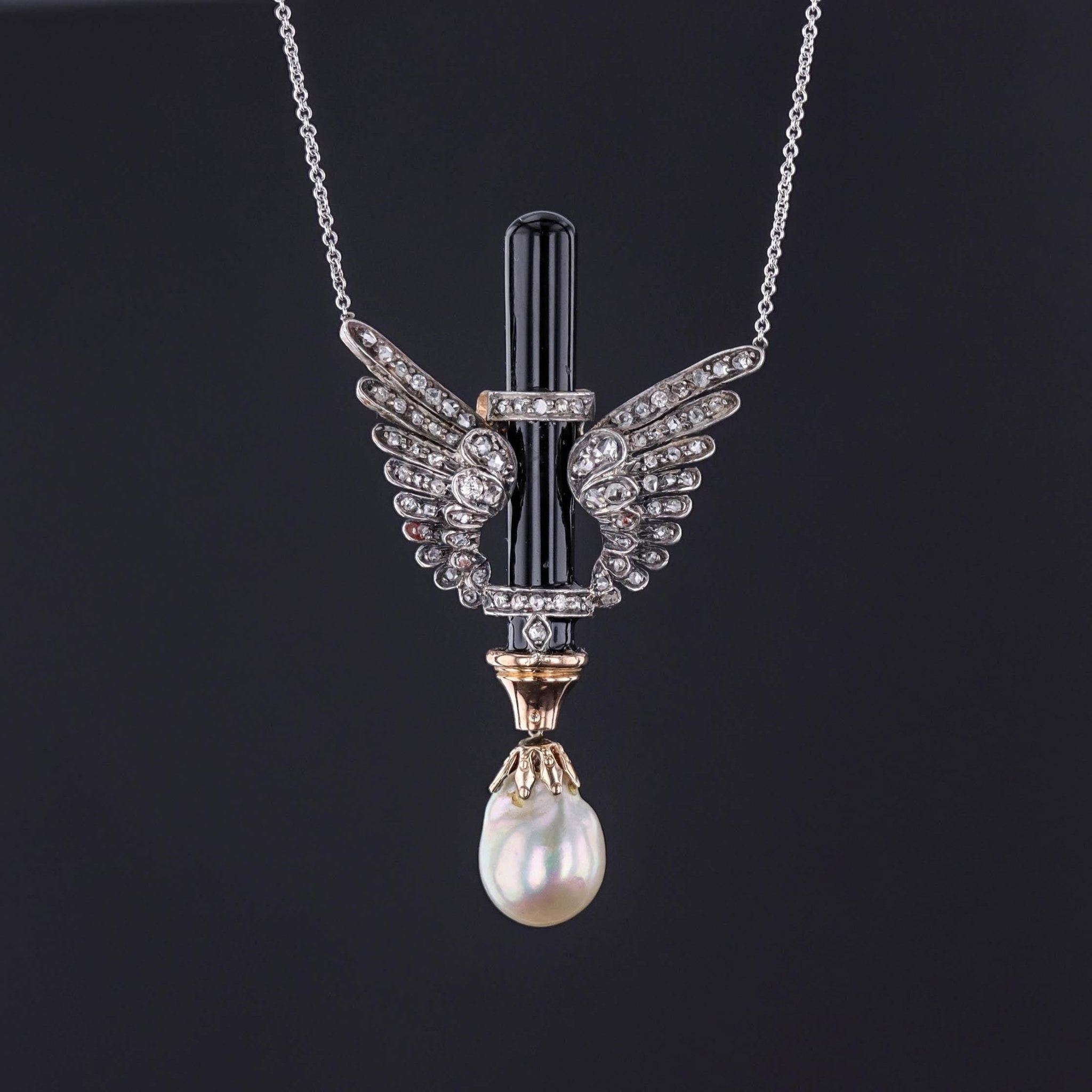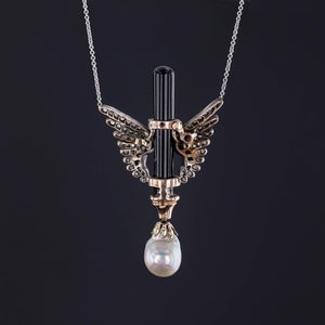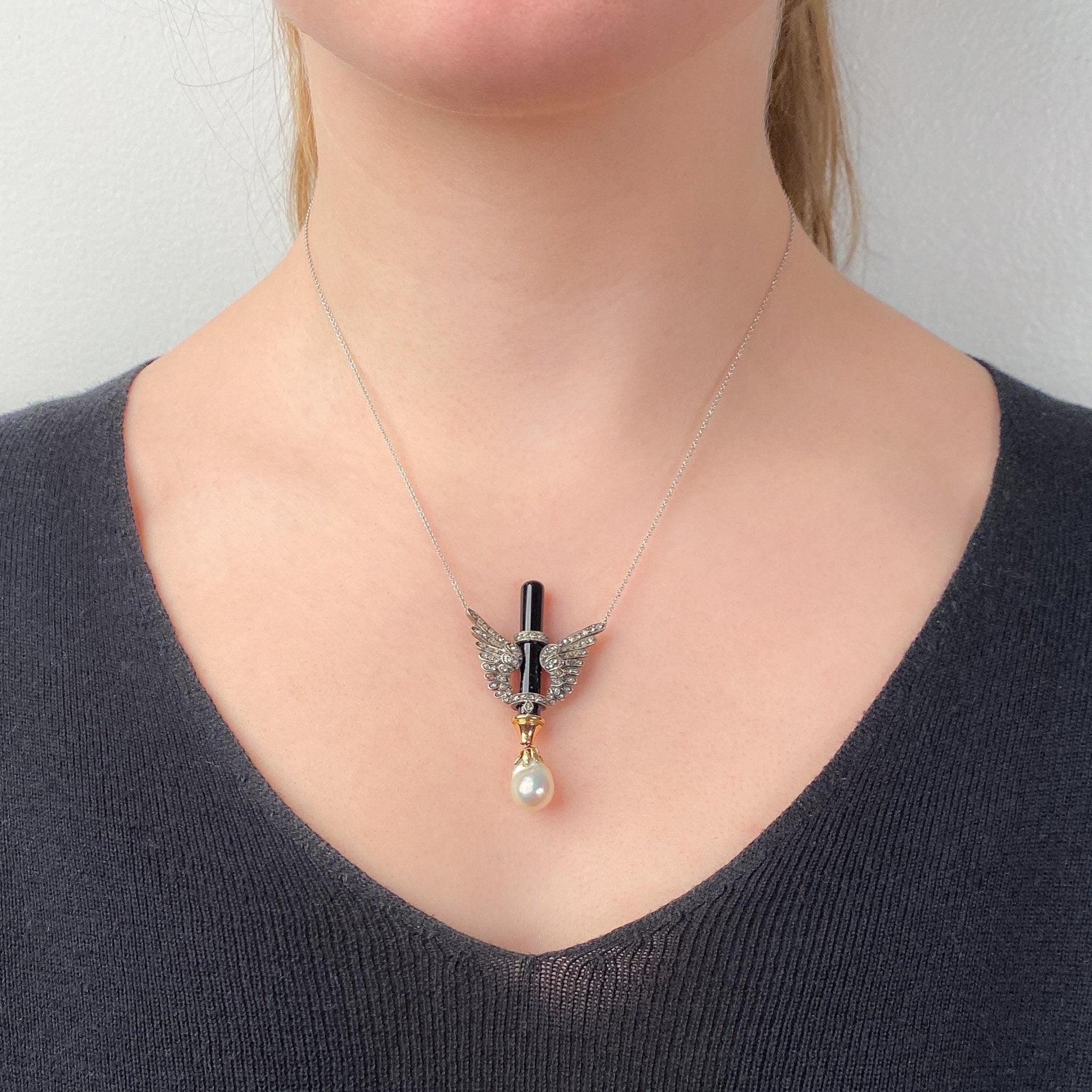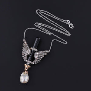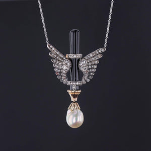 Antique Wing Necklace: This striking necklace (circa 1880-1900) features diamond wings wrapped around an onyx bar with a lustrous baroque pearl dangle. The necklace is set with rose cut diamonds. The pendant is silver topped 18k gold; while the chain, a later addition, is 14k white gold.