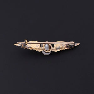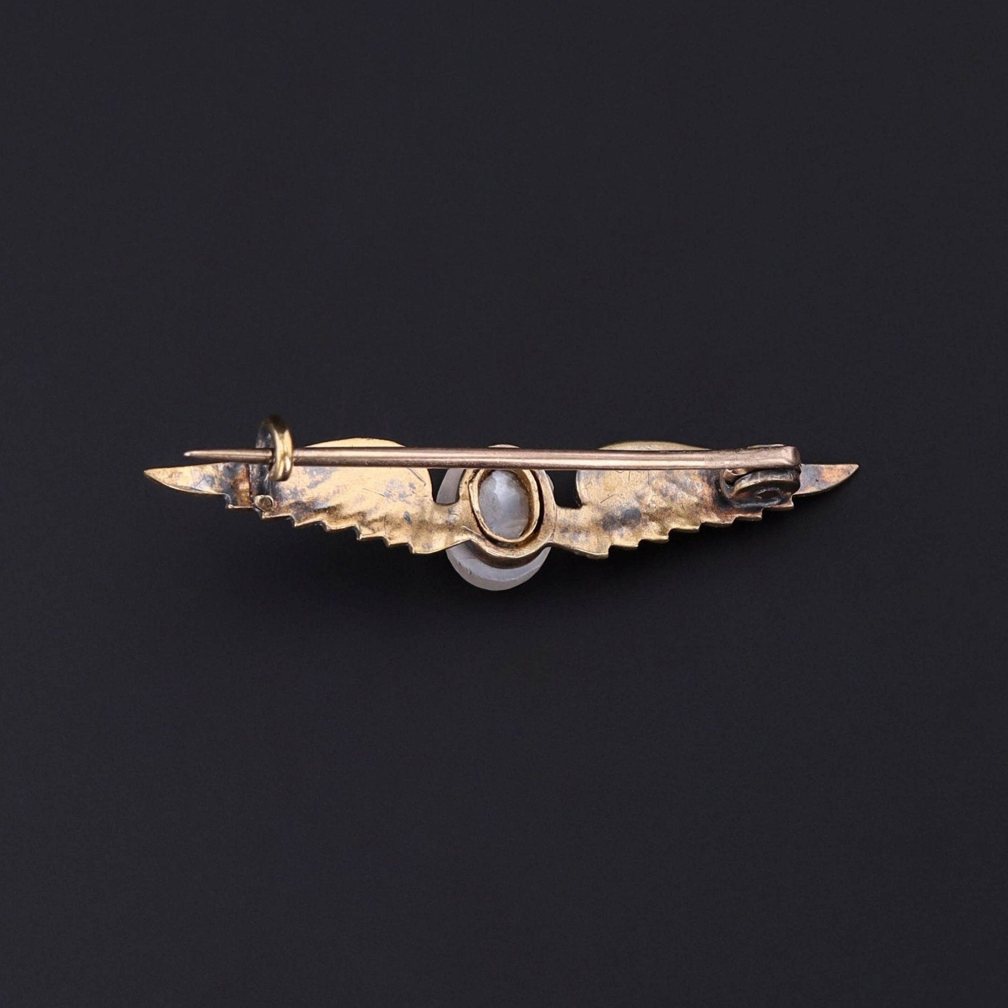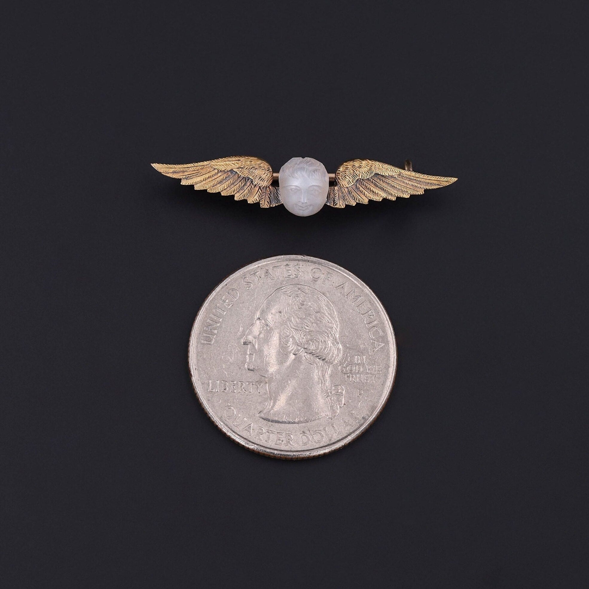 This antique 14k gold brooch (circa 1870-1890) features a cherub with outstretched wings and a hand carved moonstone face.