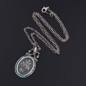 The piece is in very good condition, though under magnification two of the tiny turquoise cabochons on the bow are missing—an age-appropriate detail that does not detract from its beauty or wearability.