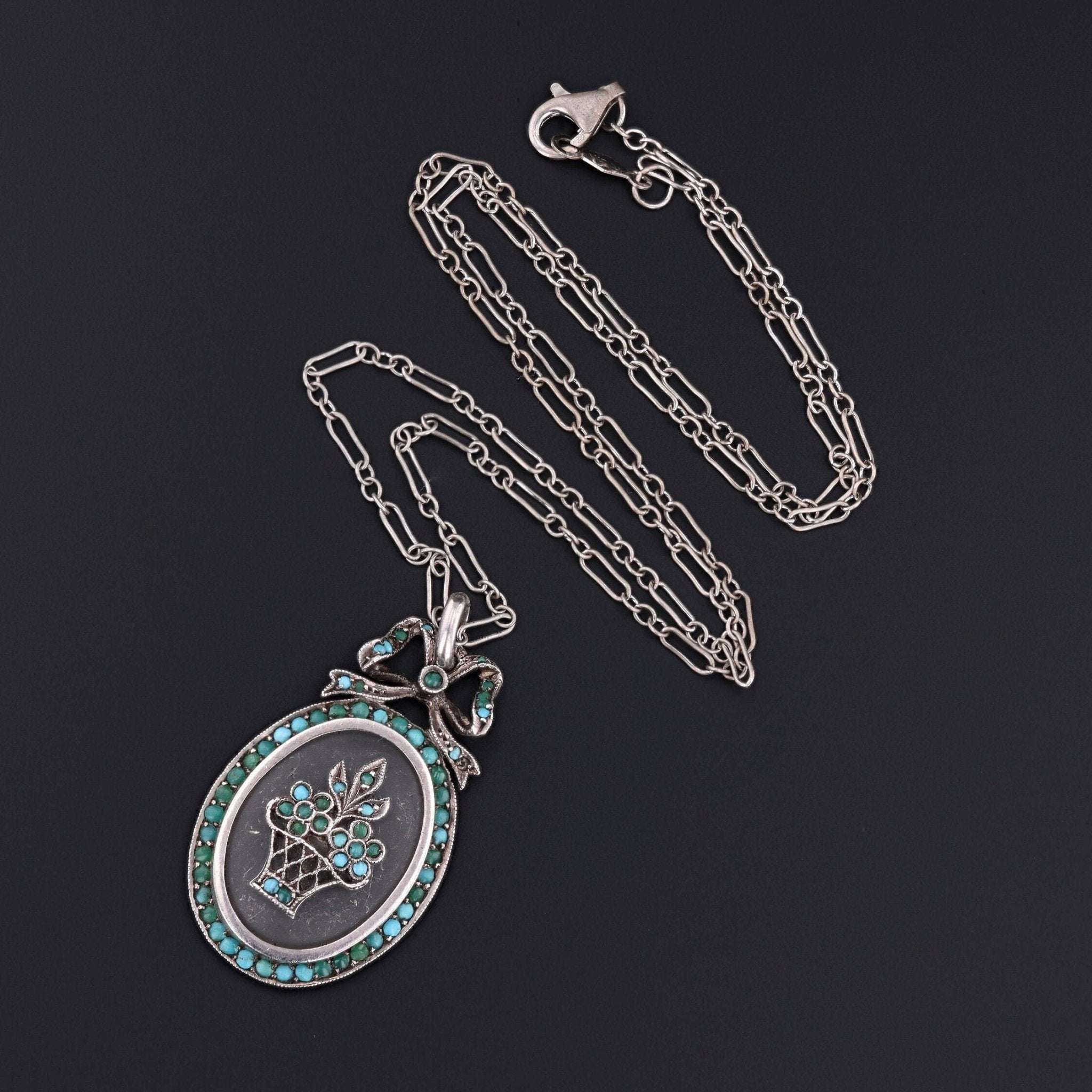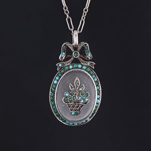 This delicate early 20th century jewel (circa 1910-1920) features a basket of turquoise cabochon flowers artfully set atop a panel of frosted rock crystal, a material prized in the Edwardian and Art Deco periods for its luminous, ethereal quality.