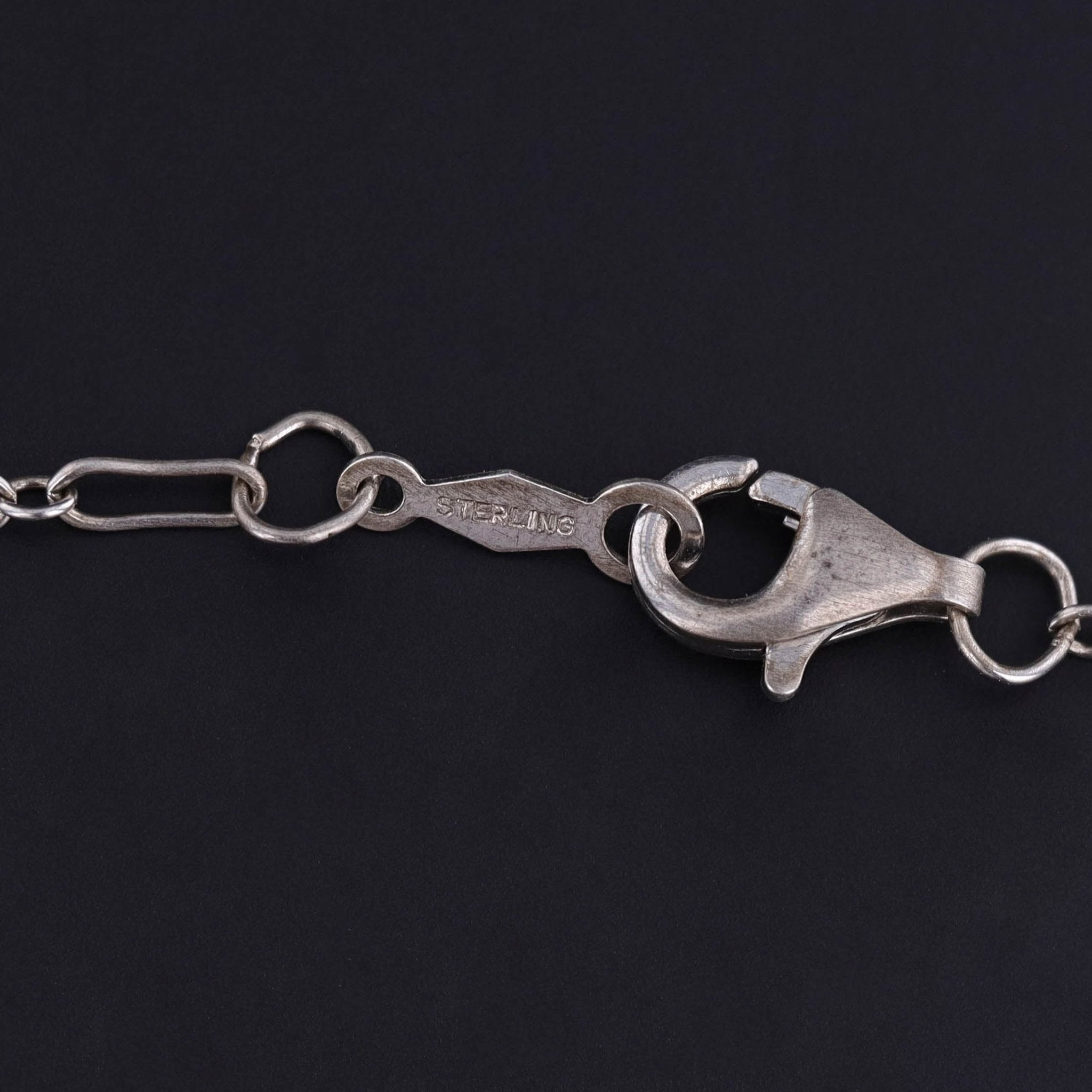 It measures 1.5 inches from the top of the bail to bottom by 0.4 inches wide and is offered on the 18-inch sterling silver chain shown in the photographs.