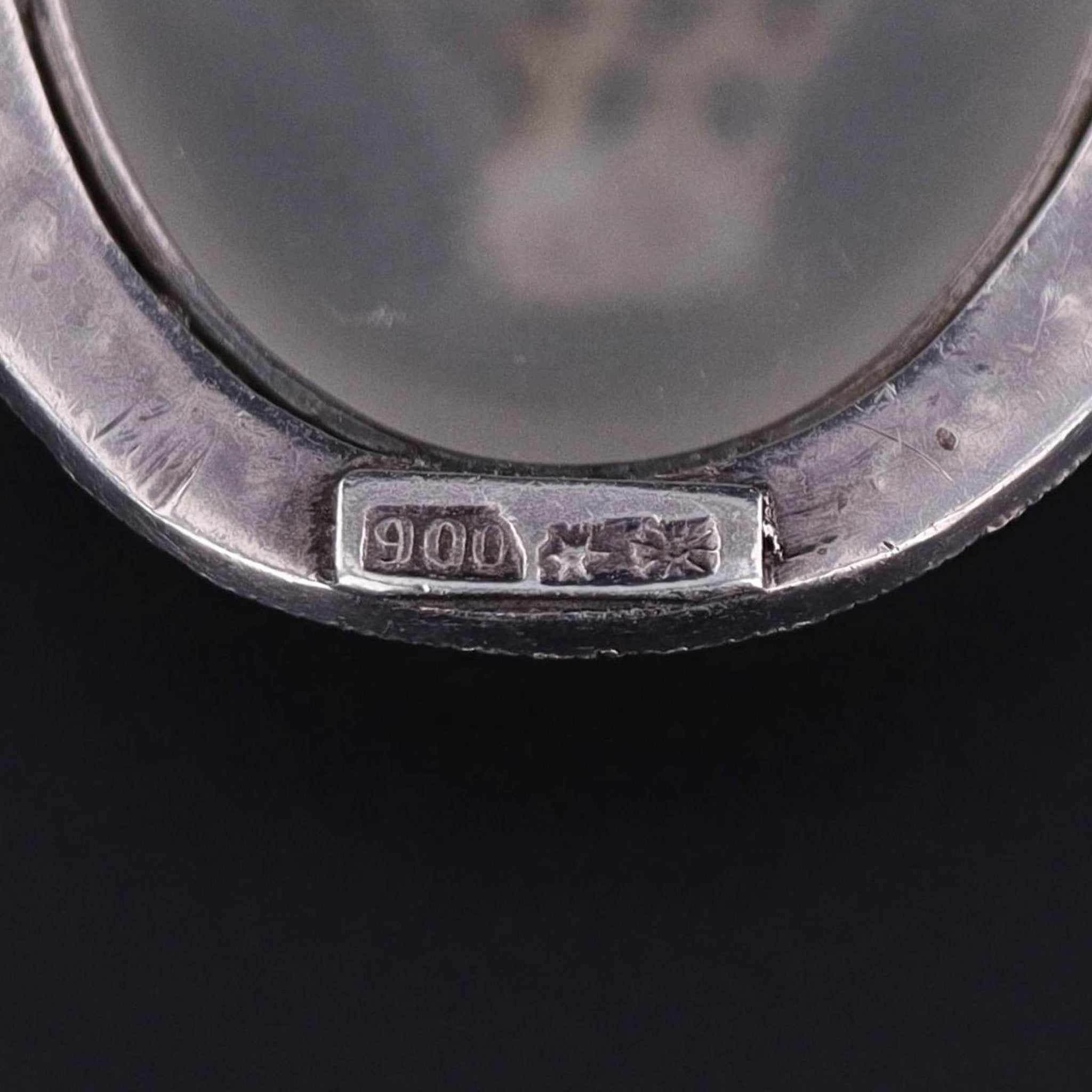 The pendant is marked for 900 silver and has been professionally tested using both X-ray fluorescence (XRF) analysis and jeweler’s acid testing to confirm its silver content.