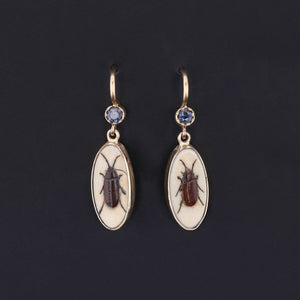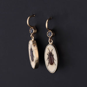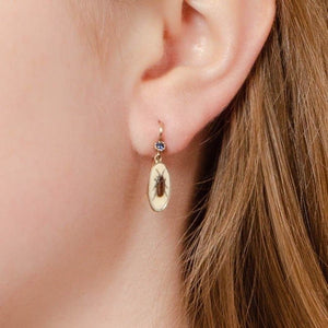 These distinctive earrings were created from antique Shibayama game pieces (circa 1880), a Japanese decorative art form celebrated for its intricate inlay work. Our jeweler carefully cut the pieces into elegant ovals, mounted them in 14k gold, and completed the design with sapphire surmounts and 14k gold ear wires. The result is a pair of earrings that beautifully fuses history, craftsmanship, and modern wearability.