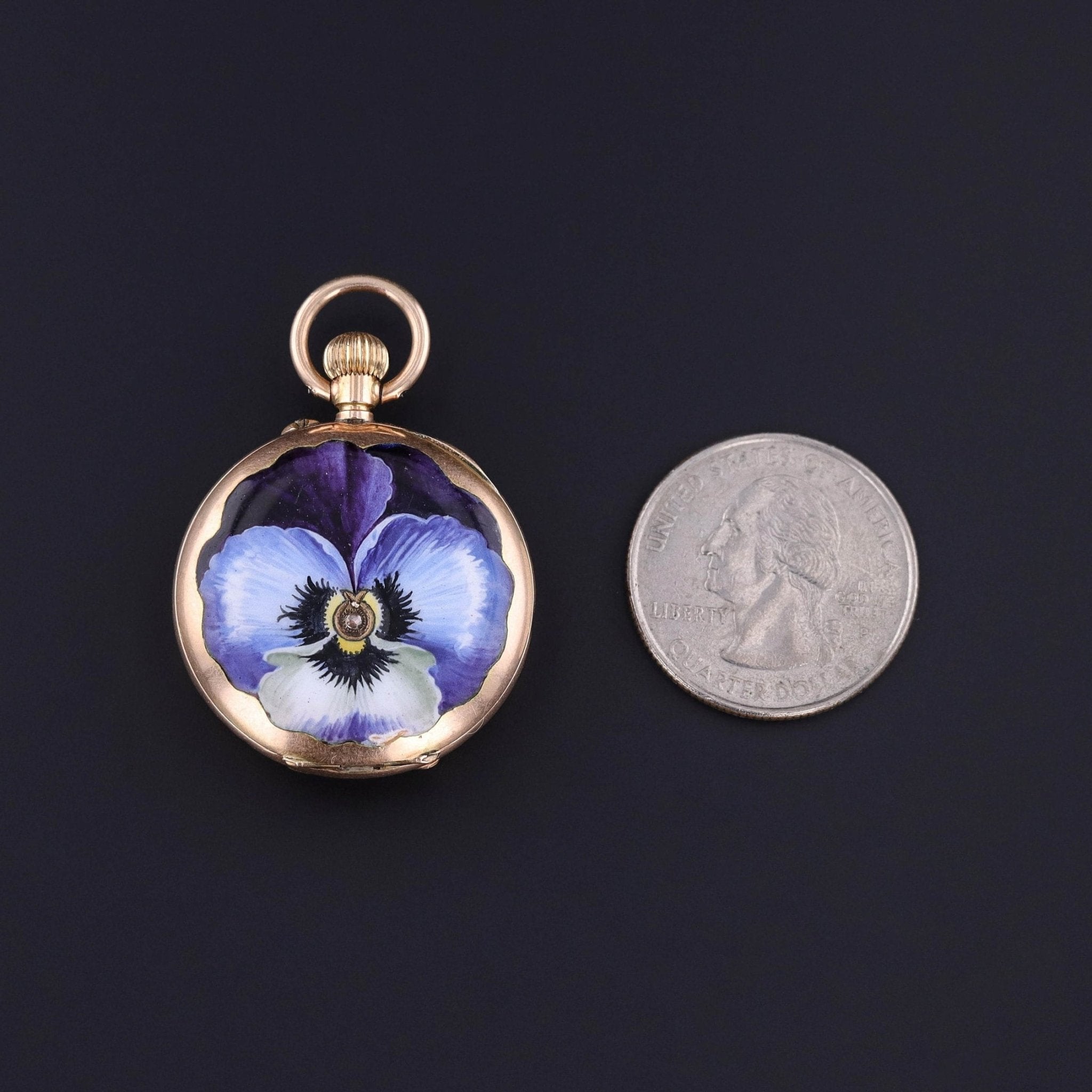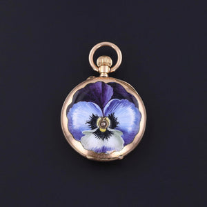 Antique Pansy Pocket Watch: Step into the elegance of the early 20th century with this antique pocket watch adorned with a purple enamel pansy and a sparkling diamond at its center.