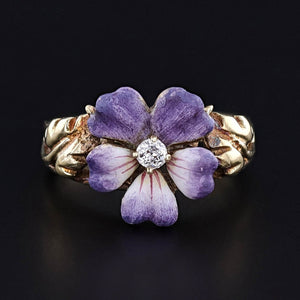 Antique Pansy Ring: Add a pop of spring cheer to any ensemble with this 1920s era ring showcasing a purple enamel pansy adorned with a glittery diamond atop a 14k gold band.