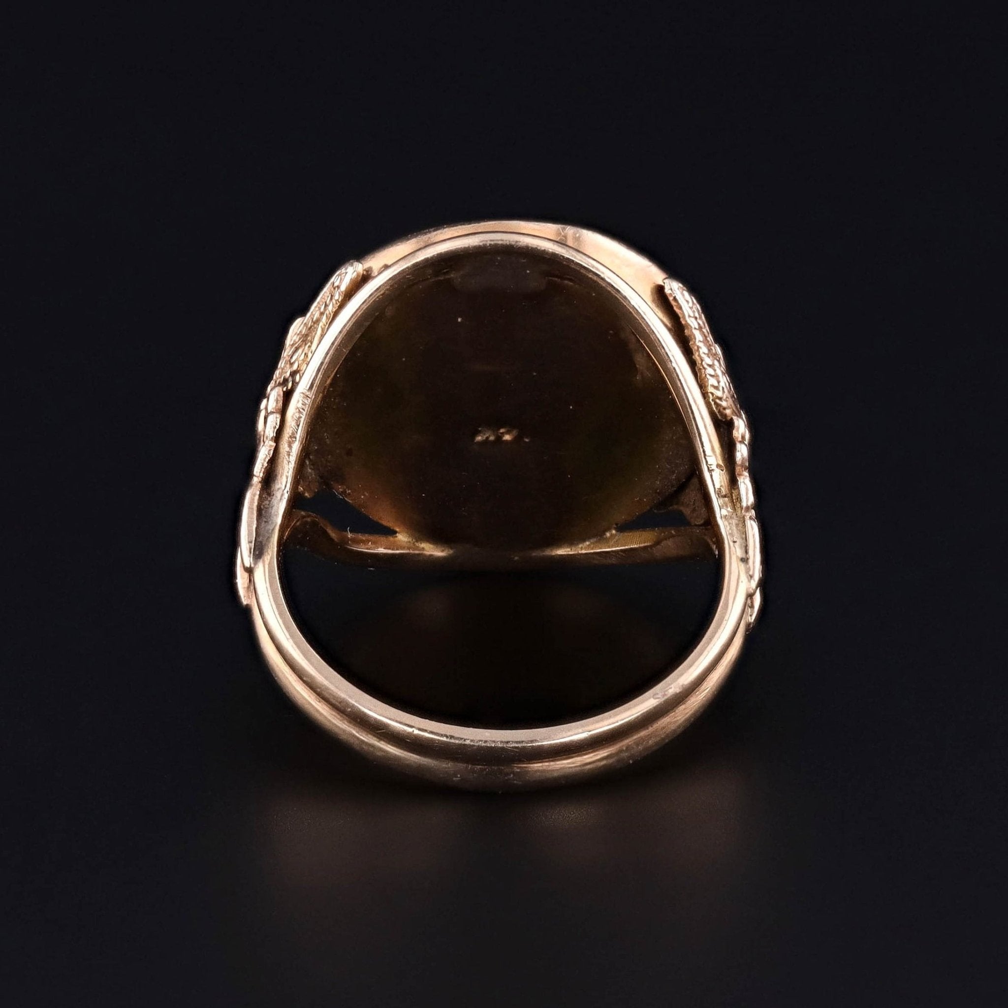 The 14k gold ring is in excellent condition and features a butterfly motif on the shoulders. The face of the ring measures 0.6 inches in diameter, and it is in great condition. The ring is a size 4, but can be resized free of charge.