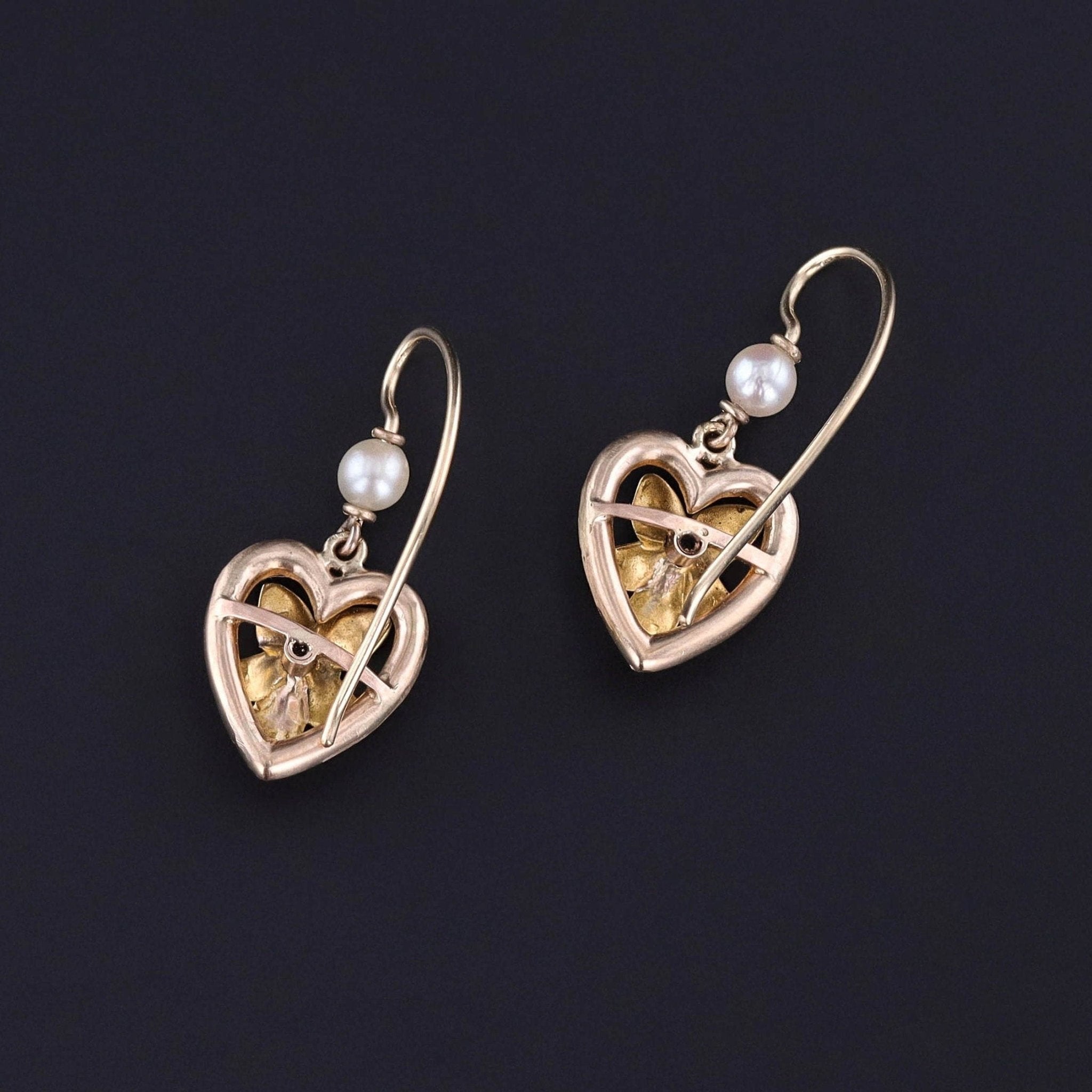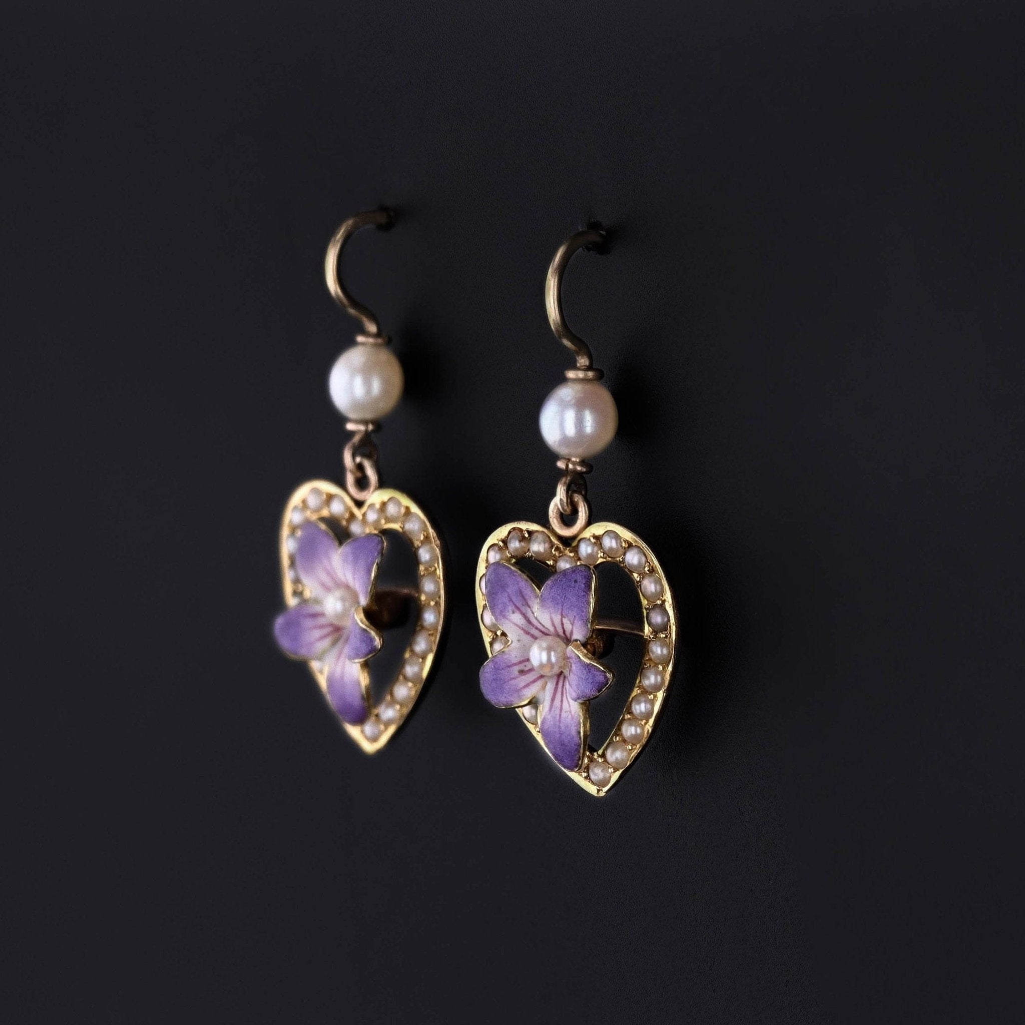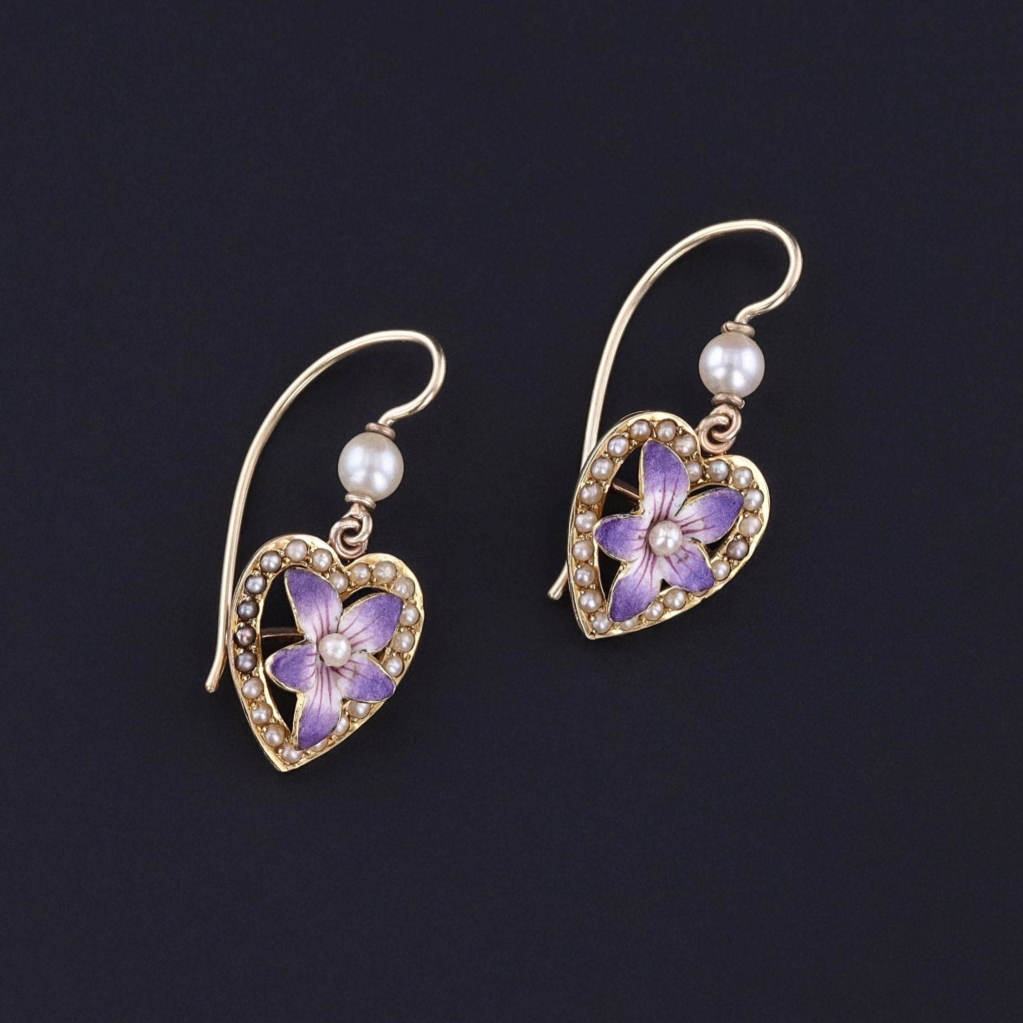 Antique Violet Heart Earrings: Adorn yourself with the charming elegance of these earrings featuring purple enamel violets nestled within hearts of pearls, all set in gleaming 14k gold. Transformed from an antique pin dating back to 1910-1920, they now boast gold ear wires and pearl surmounts, exuding timeless sophistication and vintage allure.