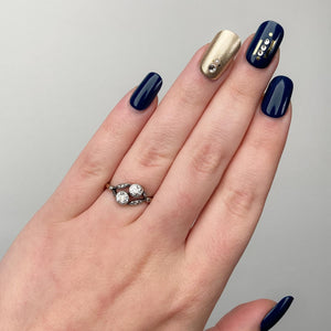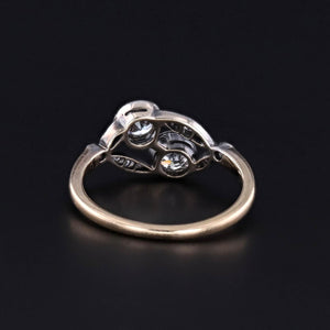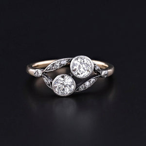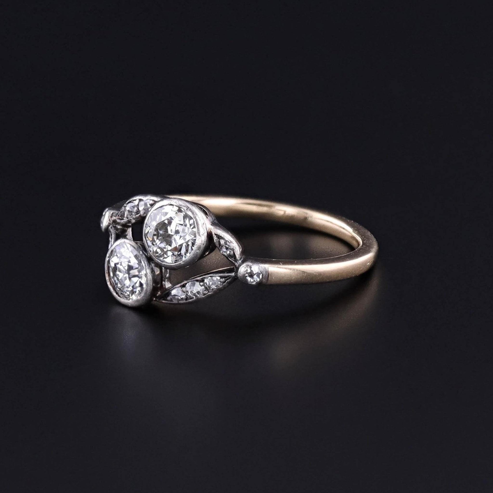 Antique Diamond Ring: This antique ring (circa 1900) features a toi et moi (you and me) motif with two, old European cut diamonds set in silver topped 12ct gold. One of the main diamonds has a total carat weight of 0.36ct, G-H color, Si2 clarity, and the other weighs approximately 0.33ct with G-H color, SI1 clarity. The total carat weight of the diamonds is 0.69ctw.