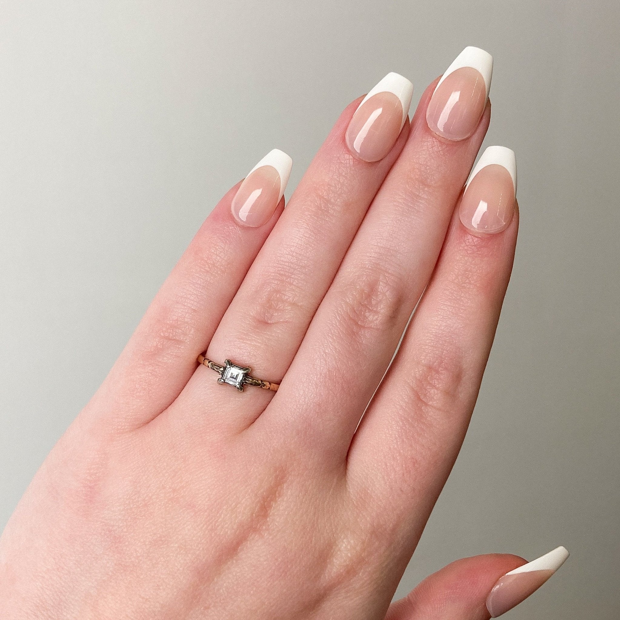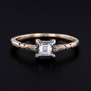Antique Diamond Ring: Step into the elegance of the late 19th century with this 1890s ring showcasing an emerald-cut, 0.26 ct diamond of F-G color, VS1 clarity set in luxurious 12ct gold.