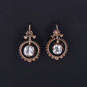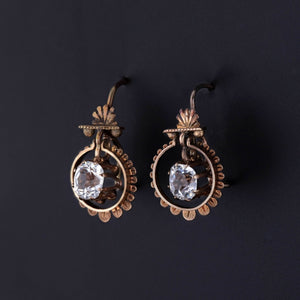 These antique earrings (circa 1880-1900) feature faceted paste (leaded glass) dangles set in 12k gold.