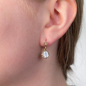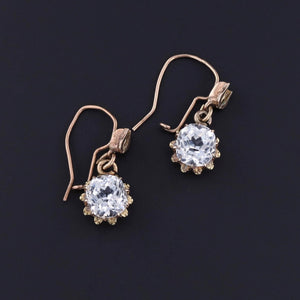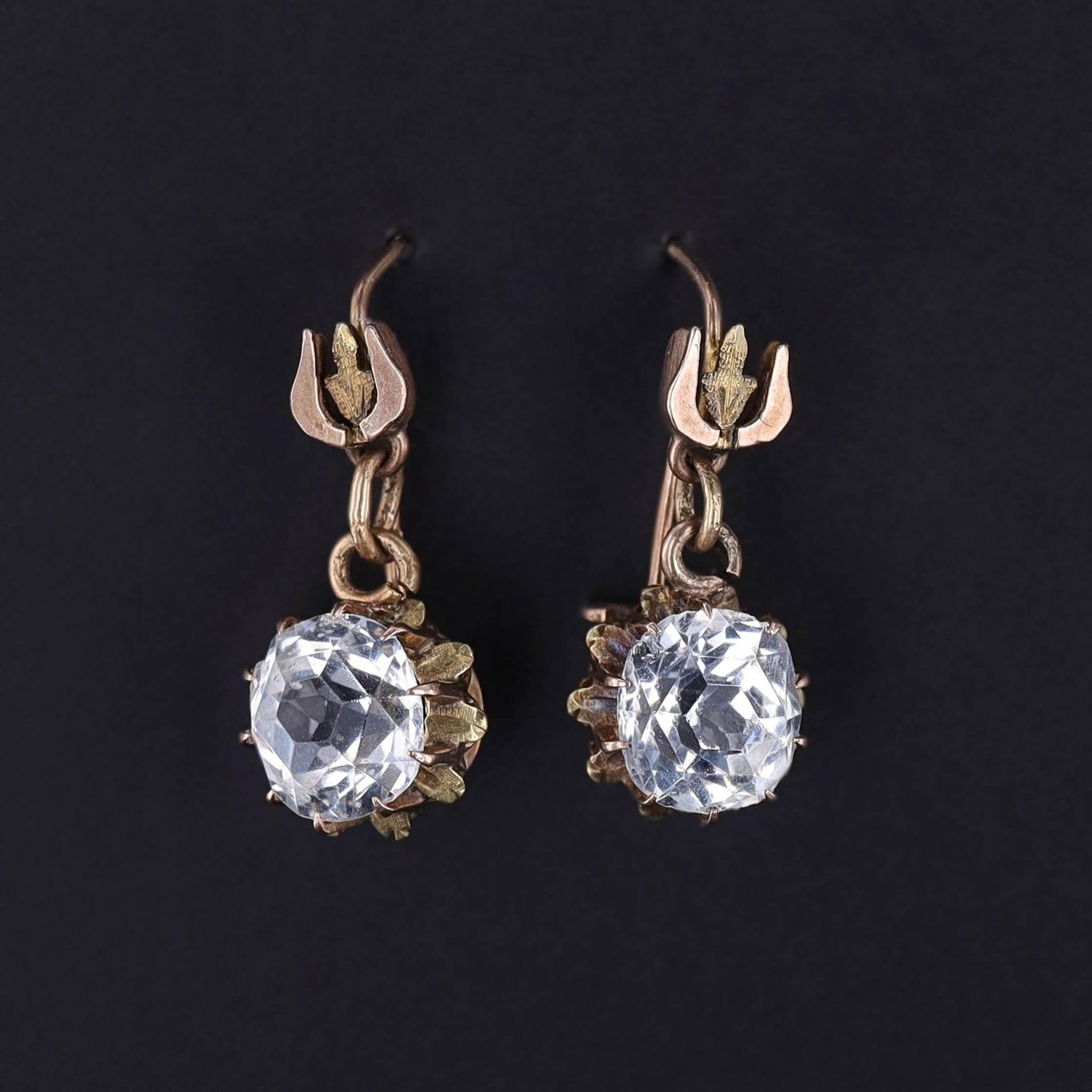Antique Victorian 14k Gold & Paste Earrings (c. 1880): These exquisite Victorian earrings, dating to 1880, showcase beautifully faceted paste (glass) gemstones set in 14k gold. With their timeless elegance and vintage charm, these earrings make a sophisticated statement, perfect for any jewelry collection.