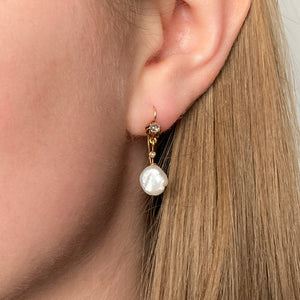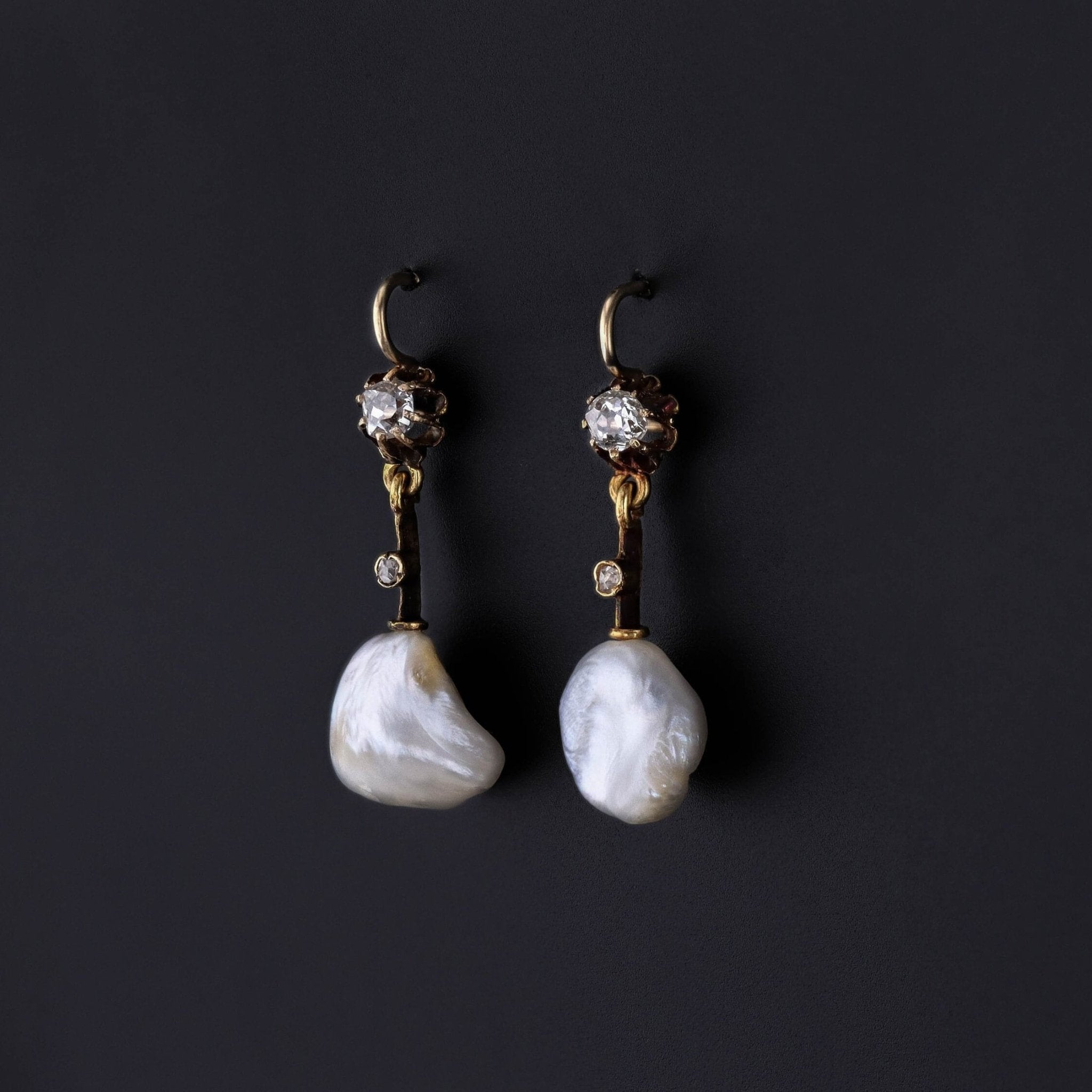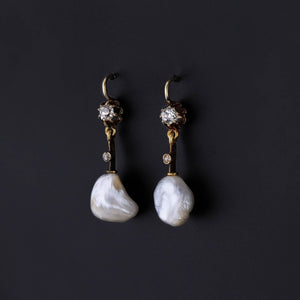 These 14k gold earrings were converted from antique jewelry components (circa 1900) and feature baroque pearls with old mine cut diamond accents.