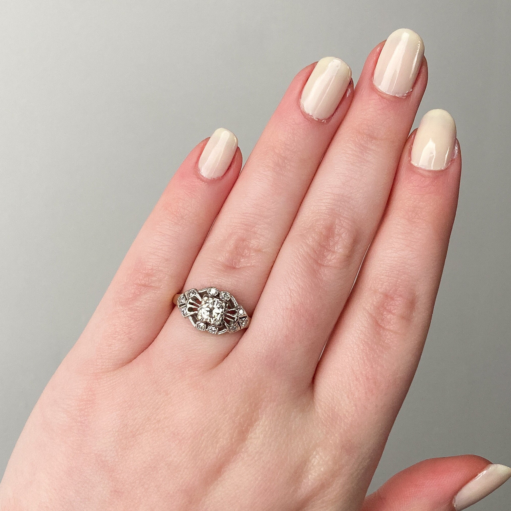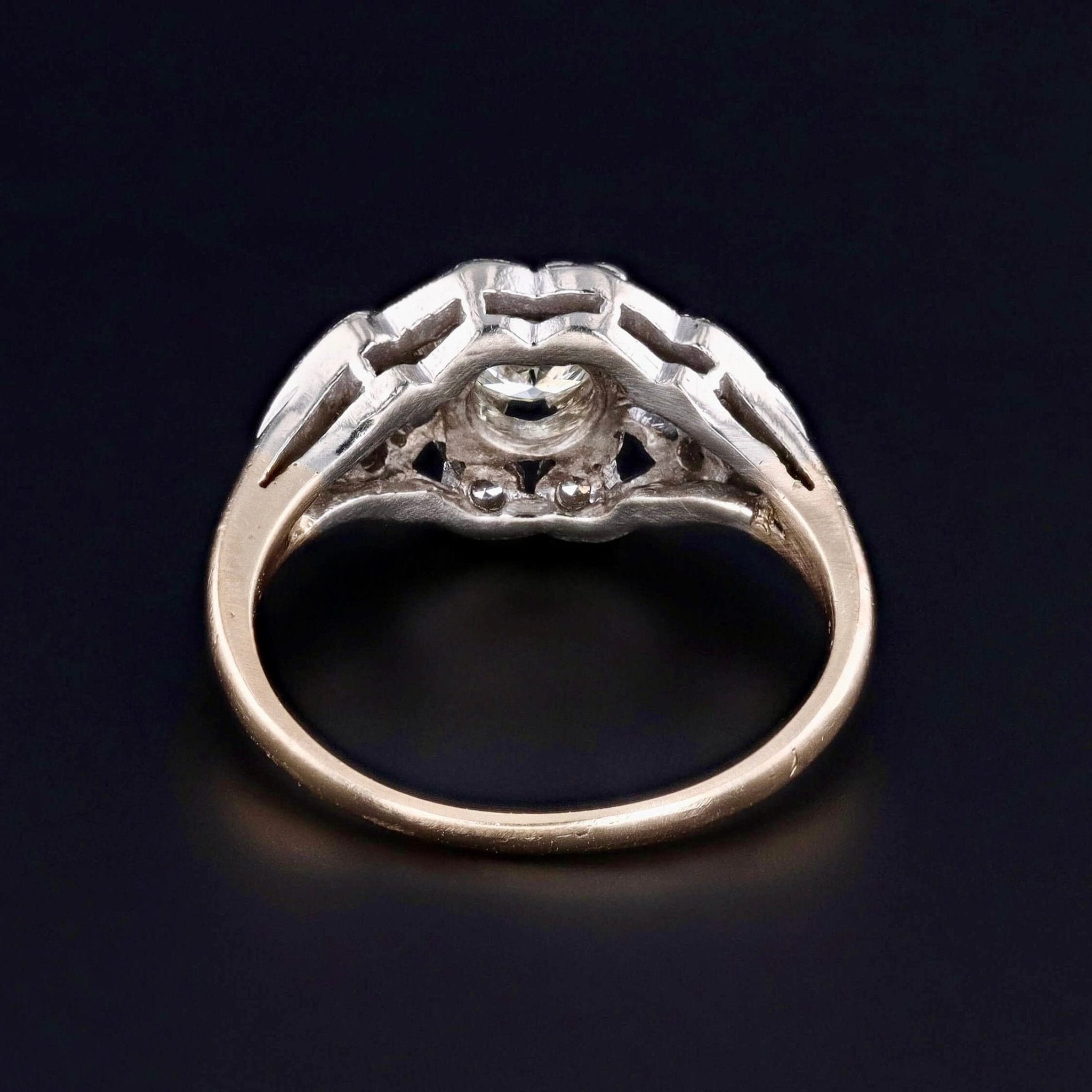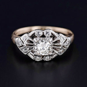 This Art Deco era ring (circa 1920-1930) features glittery diamonds set in a hand pierced 14k white and yellow gold mounting. The center diamond is a 0.40ct modern round brilliant cut diamond of J color, SI1 clarity.