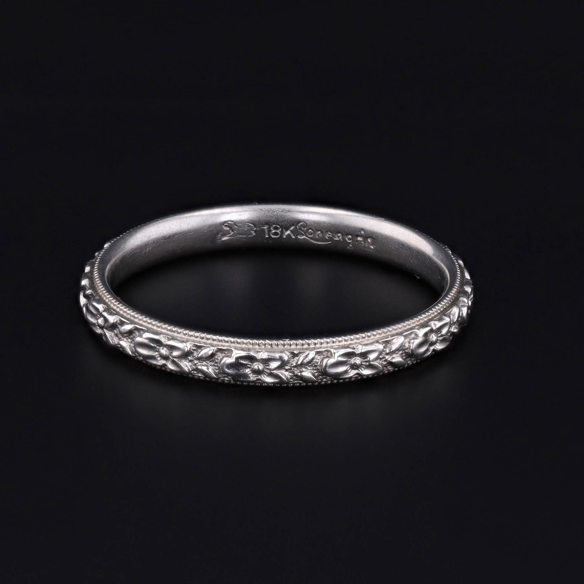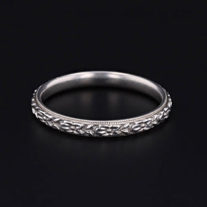 This vintage 18k white gold ring features a crisp floral pattern encircling the band.