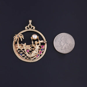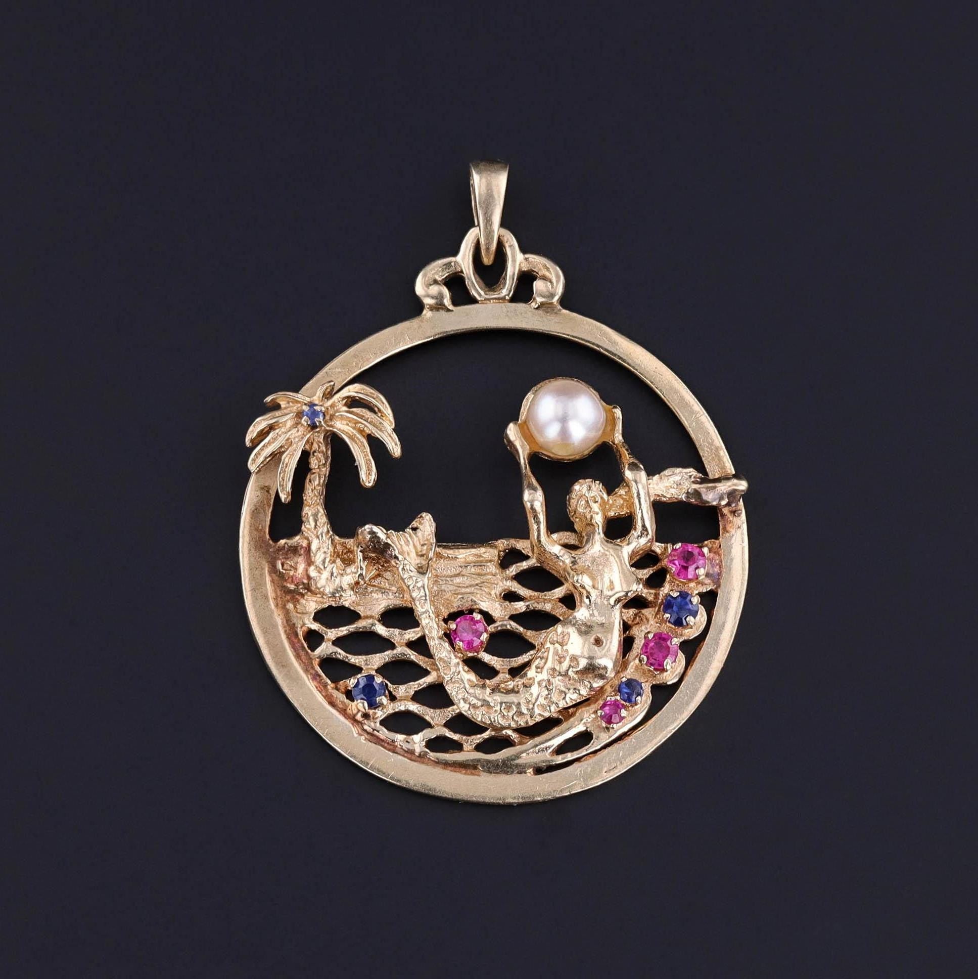 Vintage Mermaid Pendant: This vintage 14k gold pendant (circa 1950-1970) features sapphire and ruby accents and a mermaid lifting a pearl over her head.