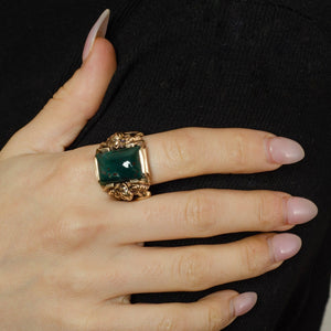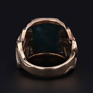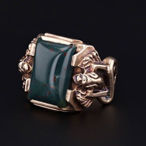 This vintage bloodstone ring (circa 1920s) features two intricately carved snakes on the shoulders of the 10k gold band. The piece is in good condition; however the bloodstone is a later replacement and not original to the mounting.