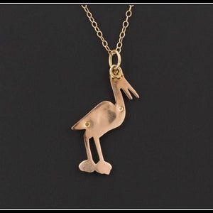This whimsical 10k gold crane charm or pendant was once an antique stick pin (circa 1900-1915) before our jeweler removed the pin stem and welded on a 10k gold bail. With exquisite attention to detail, this piece is finely and accurately rendered. The crane boasts a glimmering garnet eye. Additional garnet and pearl accents decorate its chest.