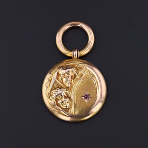 The pendant is unmarked, but acid tests for 10k gold. It features a tiny ruby accent.