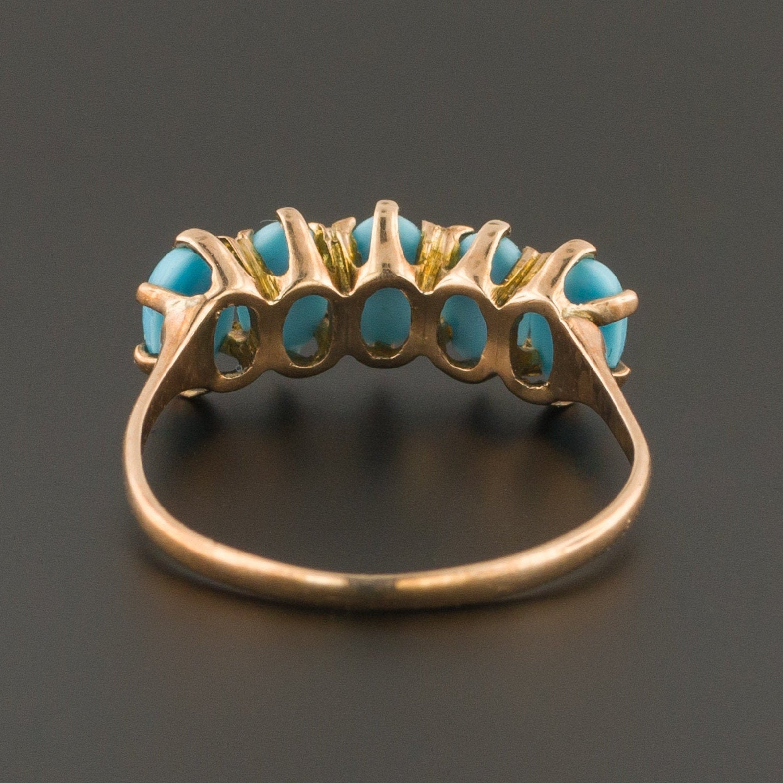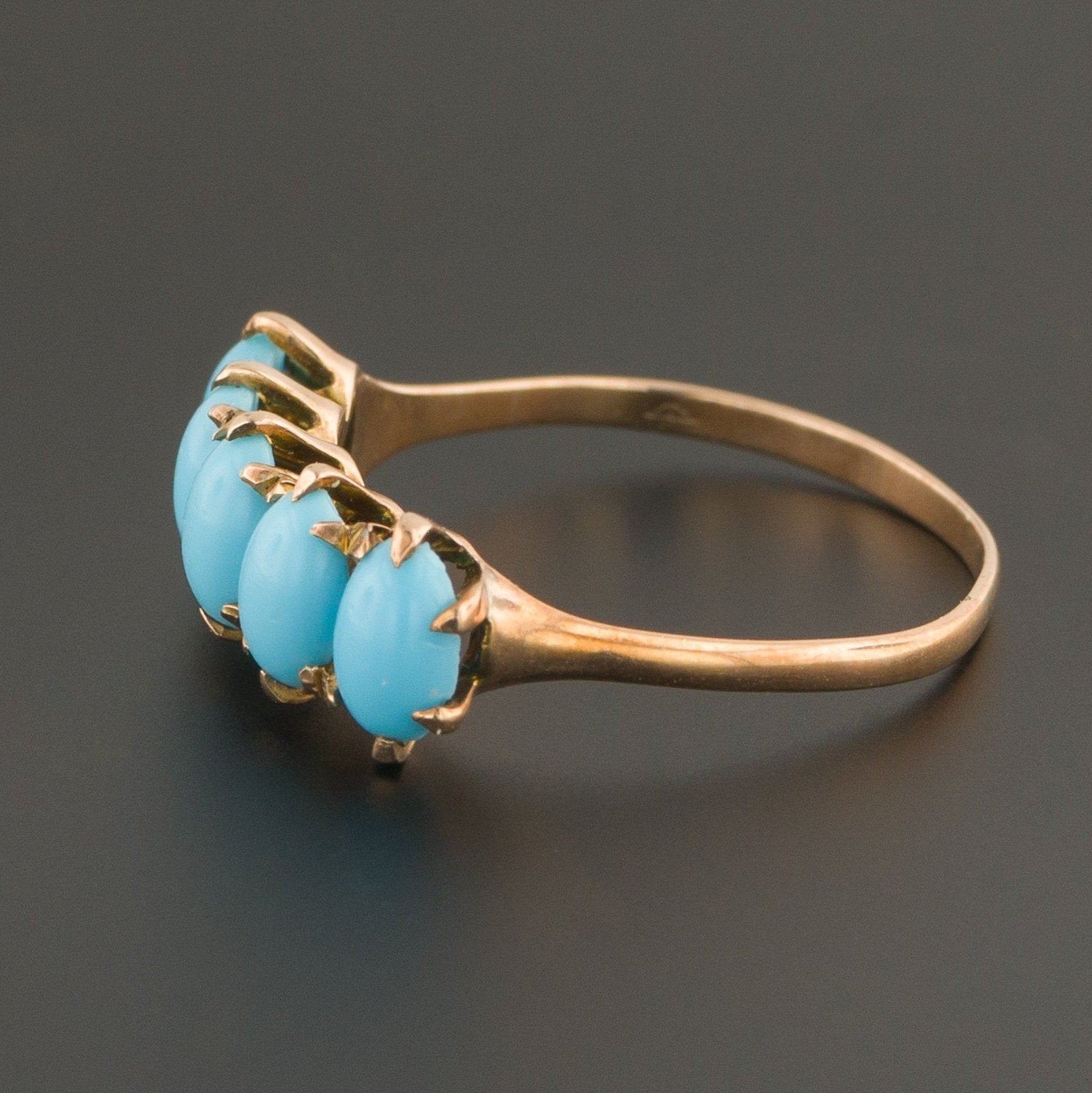 This size 6.25 ring is unmarked, but acid tests for 10k gold. The ring is in very good condition; however, there is one very small chip to the underside of one turquoise cabochon (visible only under magnification).