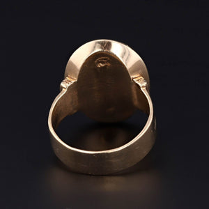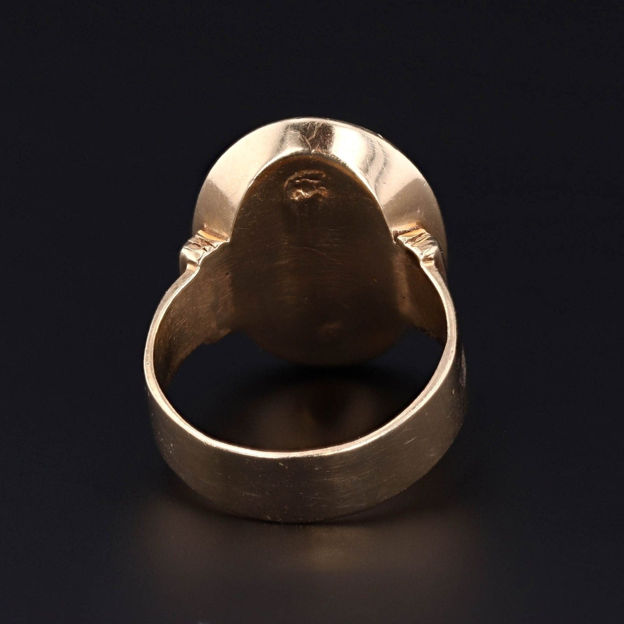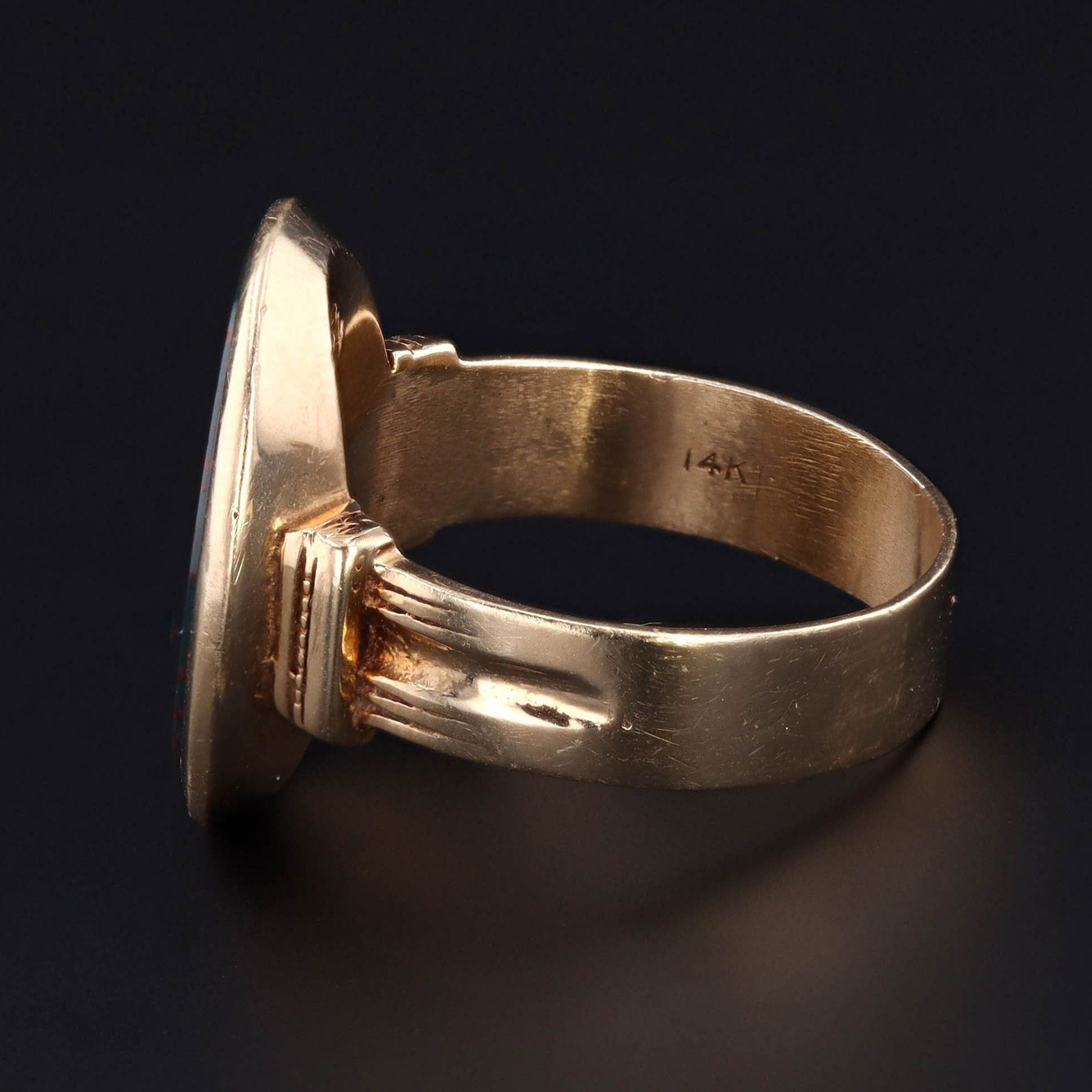 This gorgeous antique bloodstone ring is perfect for anyone with a passion for history or antique jewelry. The late Victorian era signet ring (circa 1890-1900) features a hand carved intaglio depicting a crest. The intaglio is set in a substantial 14k gold mounting.
