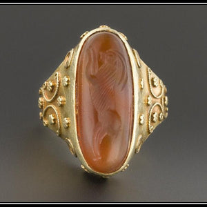 This spectacular vintage ring (circa 1950-1970) features an oval carnelian intaglio depicting a ram (the symbol for the Aries zodiac). Lovely hand set wire work and granulation details ornament the 14k gold band.