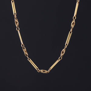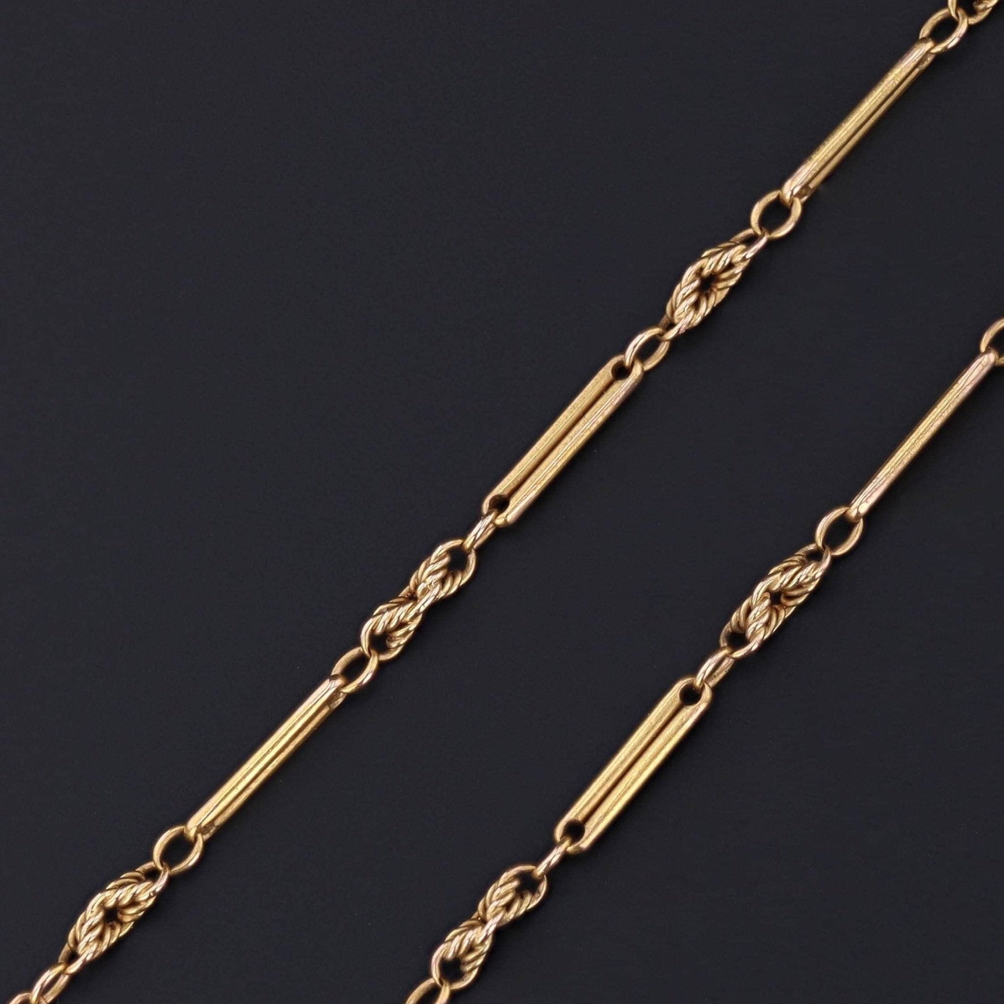 The necklace (circa 1910-1920) is 14k gold with alternating bar and knot links.
